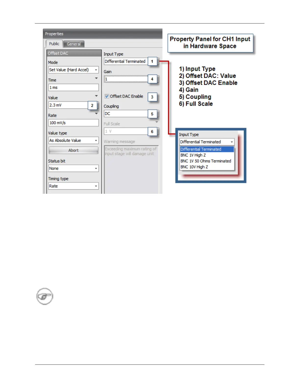 The Input Type (1) drop down box selects the input connector, input impedance, and full scale voltage