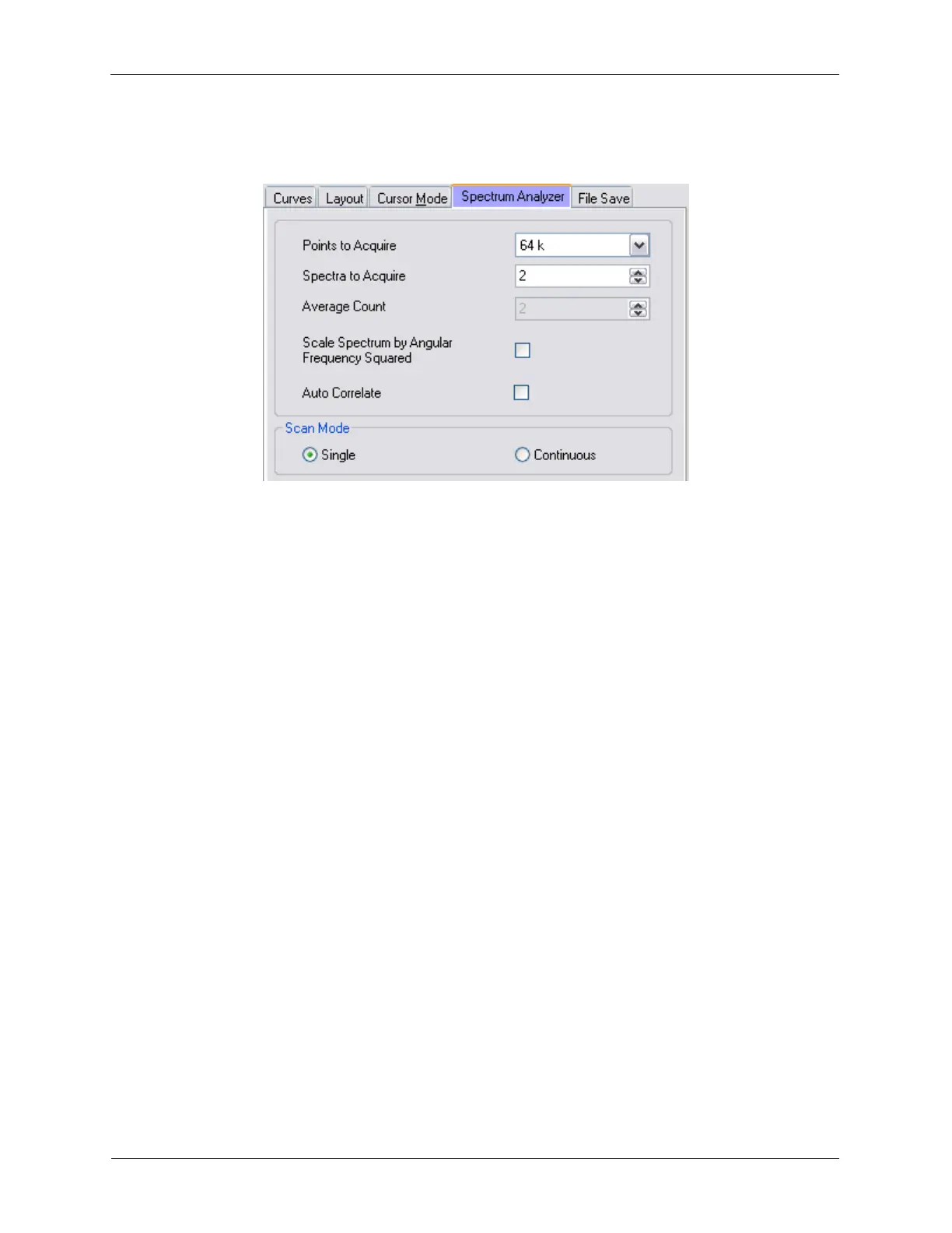 • Spectra to Acquire: controls the number of FFT curves to average together when using Scan Mode -