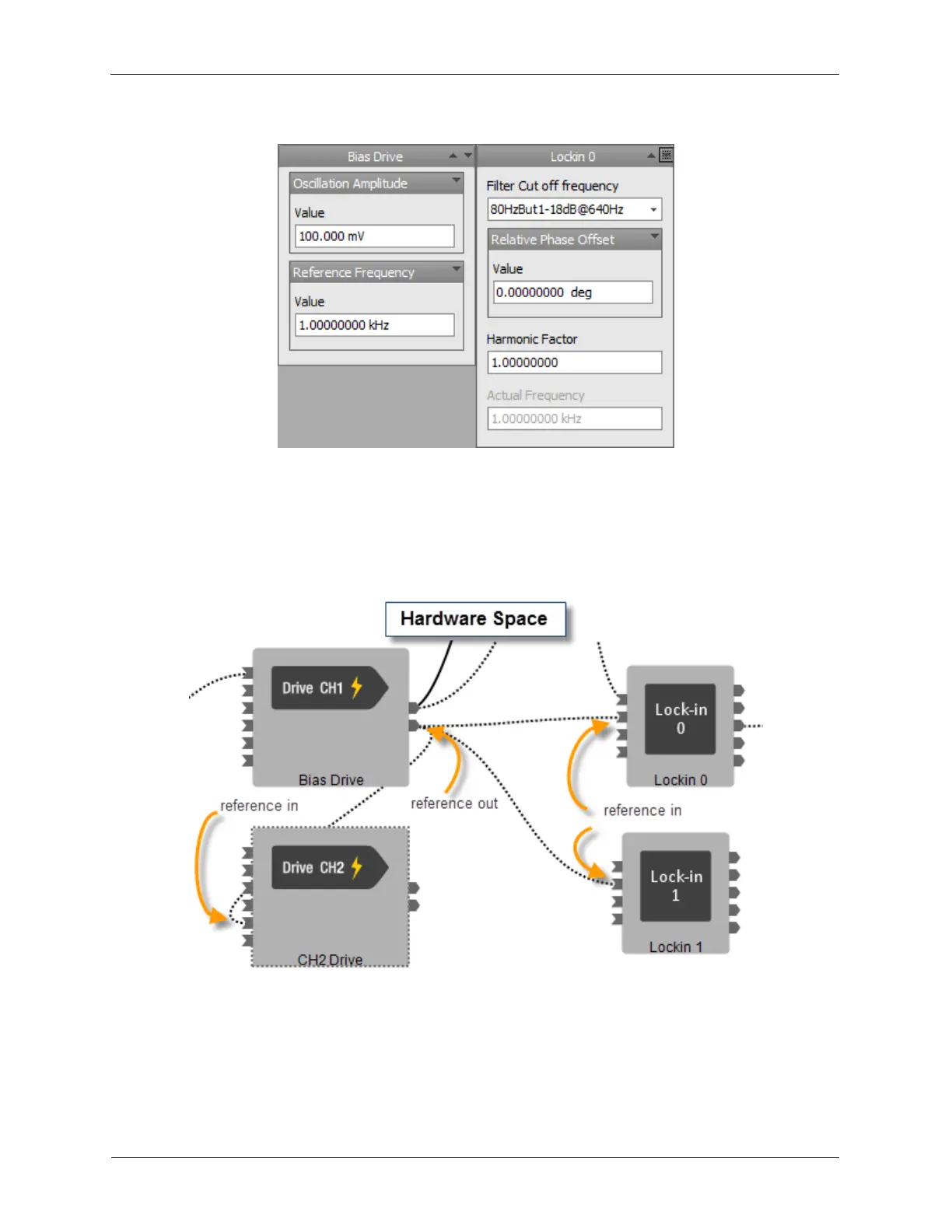 so it will detect signals at 1.000 kHz. Lockin1 has a Harmonic Factor of 2 and a Frequency Offset of 100