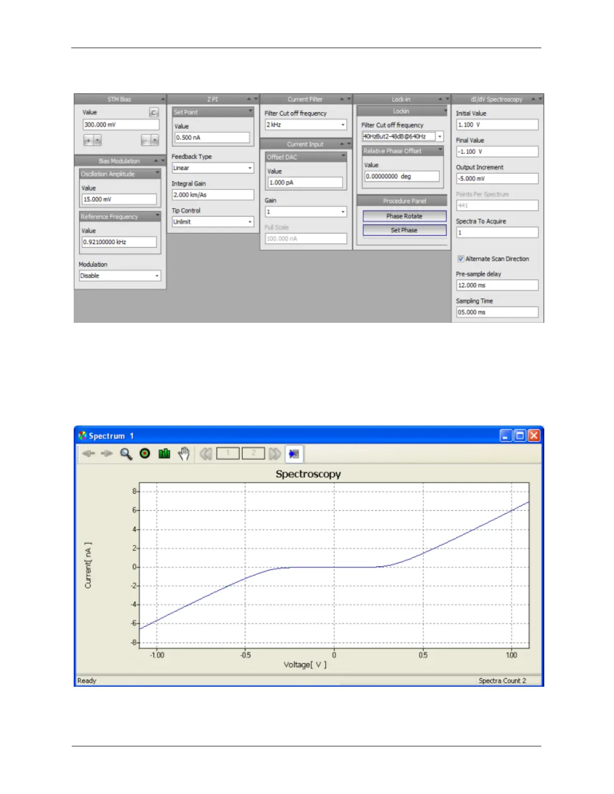 setting the dI/dV Spectroscopy Settings for the dI/dV measurement. An IV Spectroscopy result is