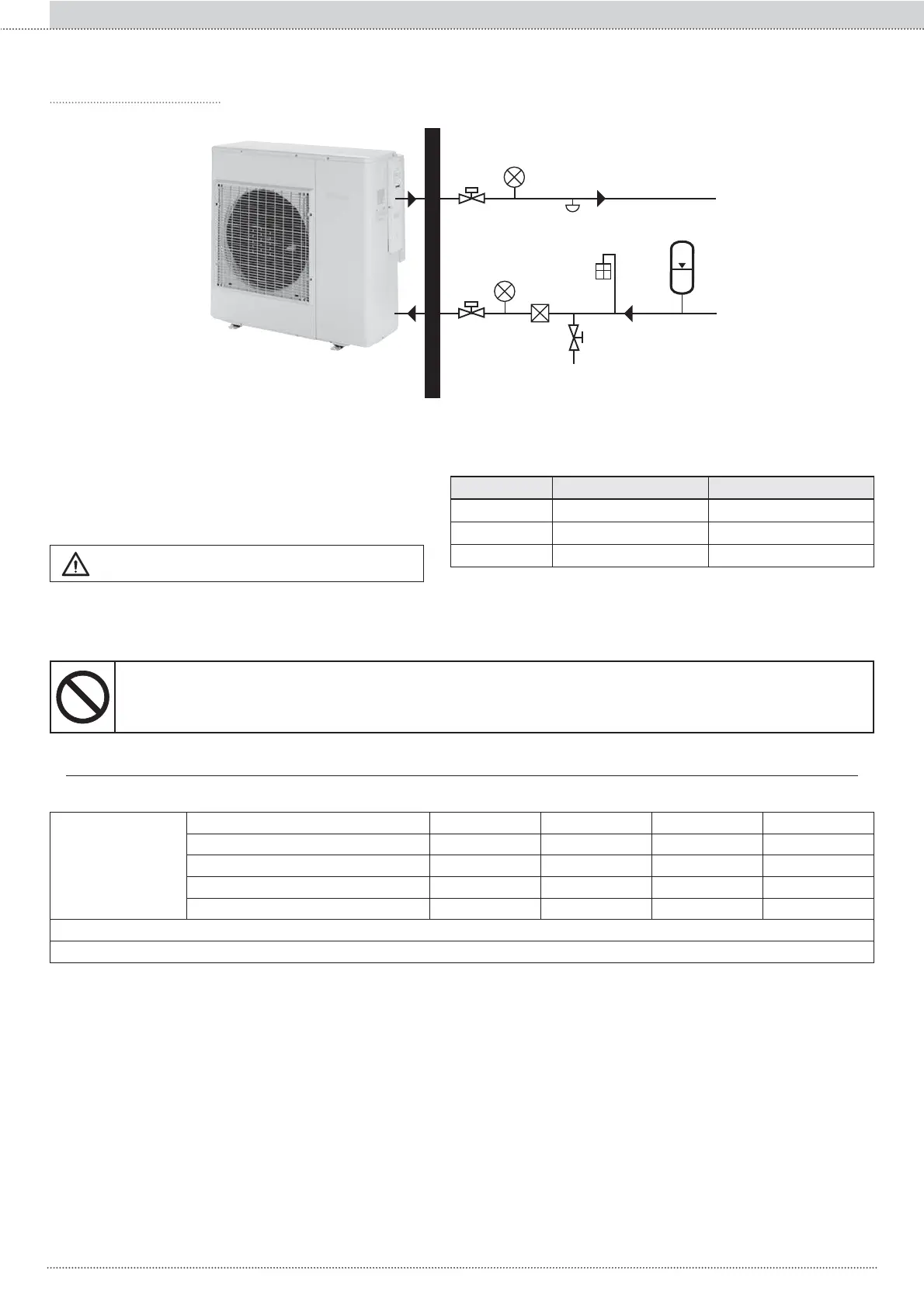 • La quantité d'eau dans l'installation (tuyaux+bornes+arriéré) ne doit pas être inférieure aux valeurs indiquées dans le tableau.