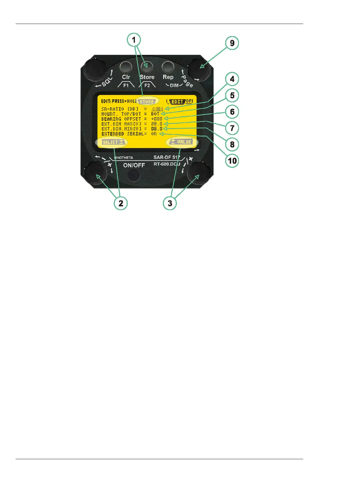 (3) >Value< rotary switch used to change values in menu options (>Store< (1) has to be pressed in parallel if