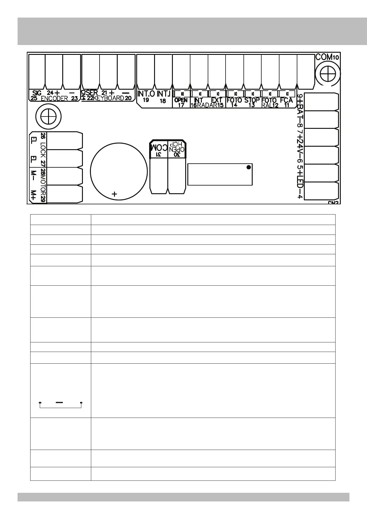 Ingresso N.O.. Se chiuso con l’ingresso COM (10-31) comanda l’apertura della porta mantenendola aperta fino