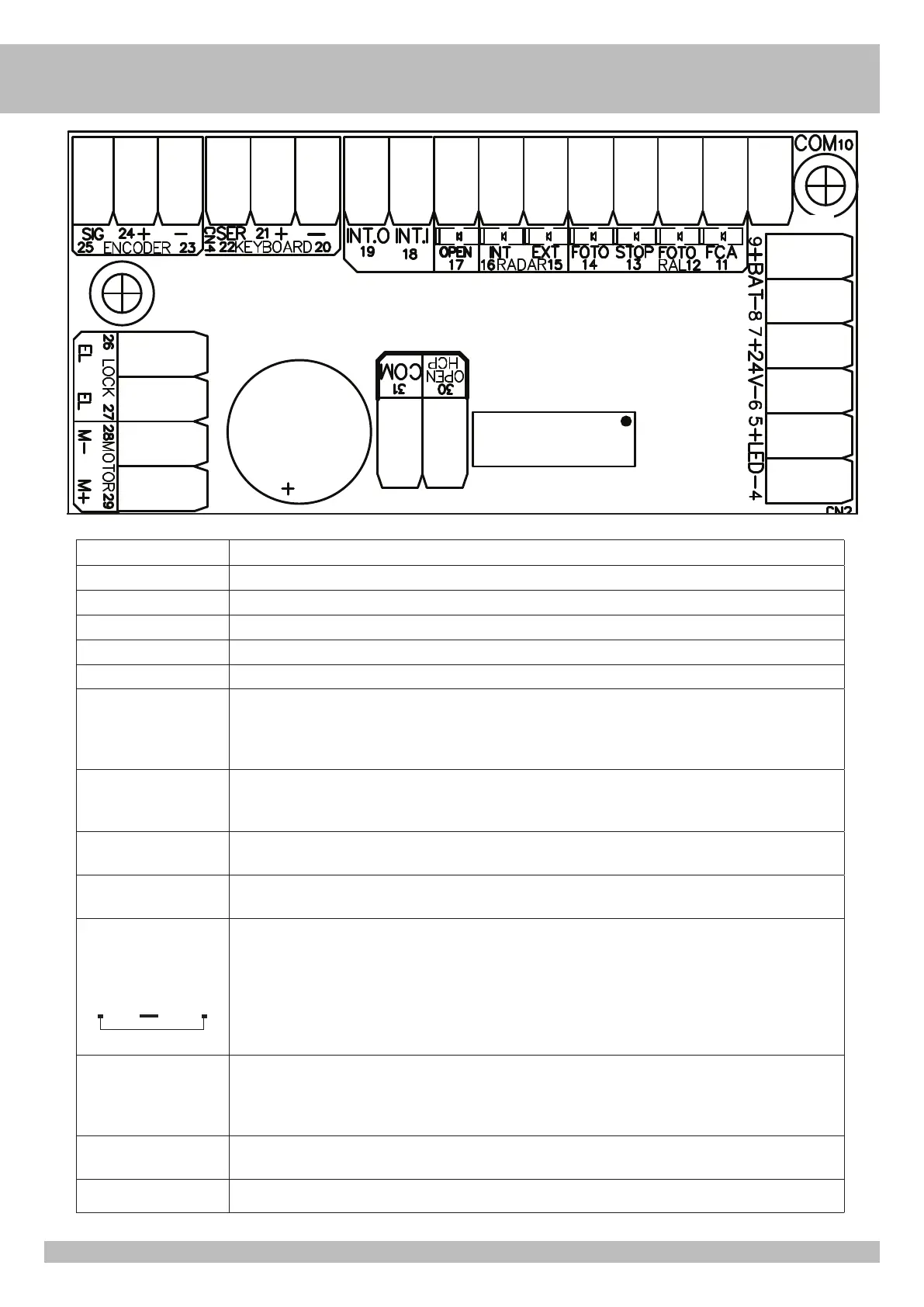 Entrée N.O. Si fermée avec l’entrée COM (10-31), commande l’ouverture de la porte en la maintenant ouverte