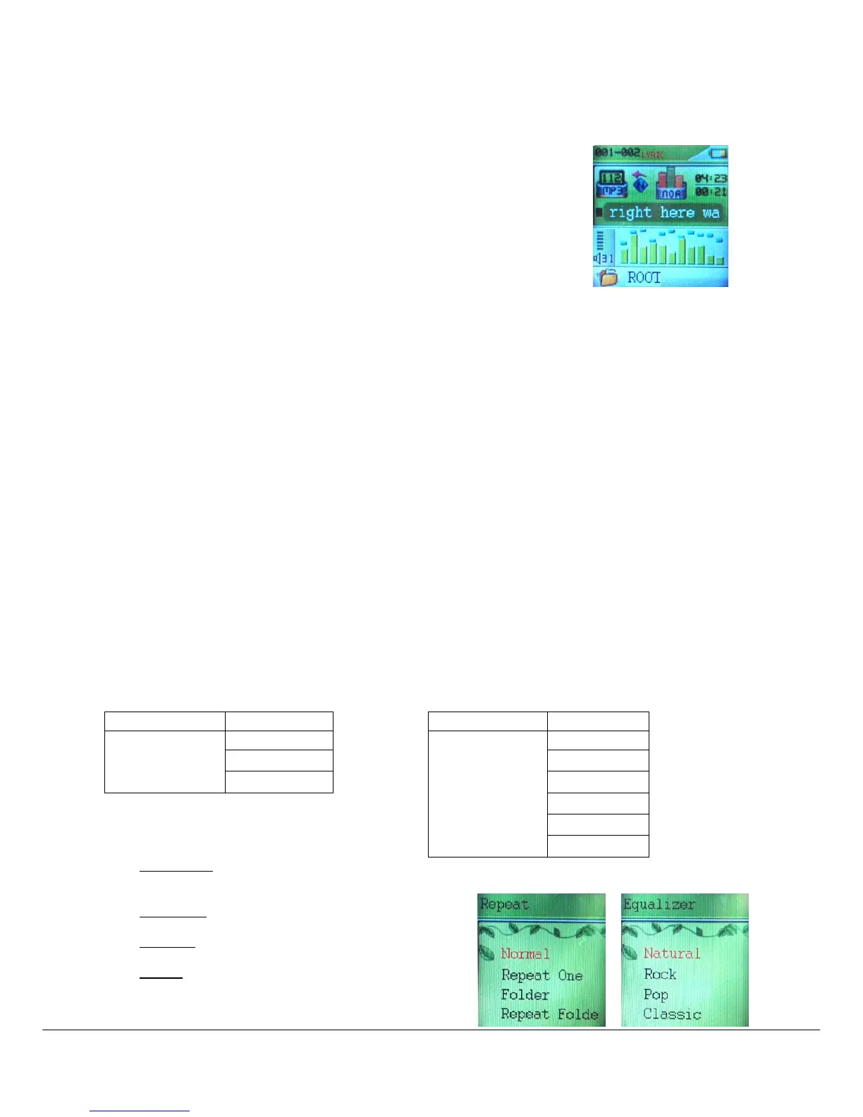 By short pressing the MENU [M] button, you can find the following music submenus. Press [] or [] to