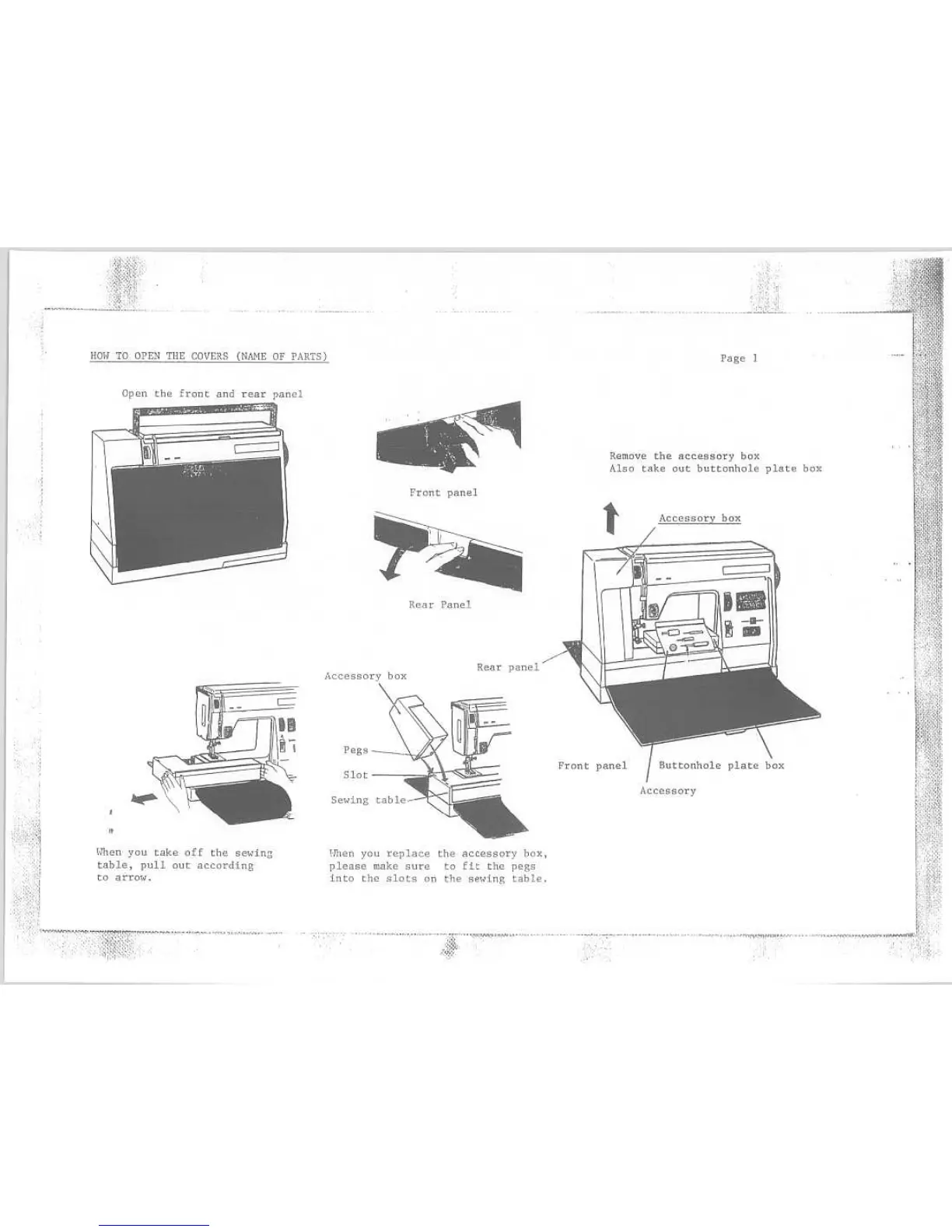 Riccar M40 - How to Open Covers and Identify Parts; Opening Front and Rear Panels; Accessory and Buttonhole Plate Box Handling