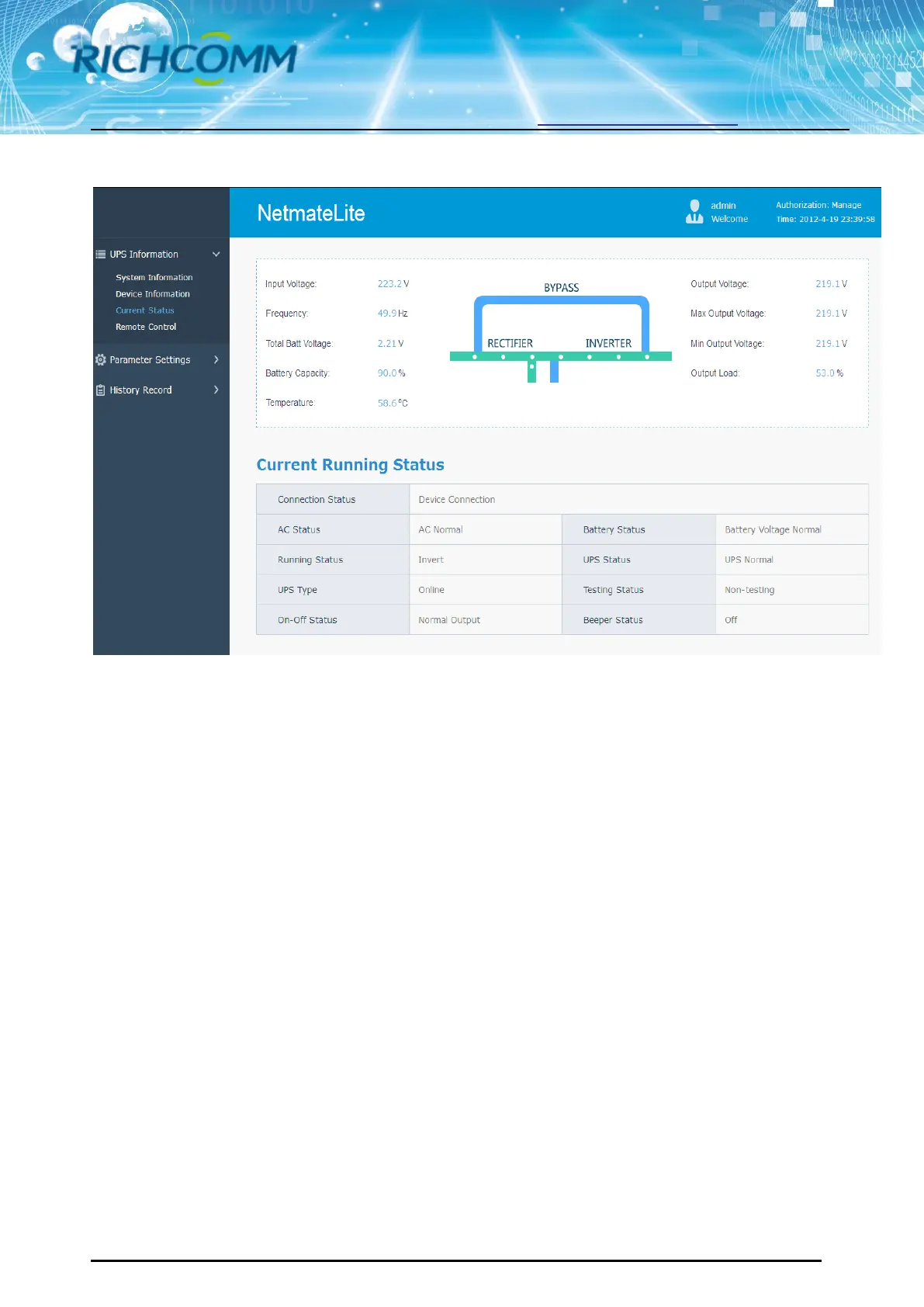 This page is to display UPS basic information and network information. The info shown here are