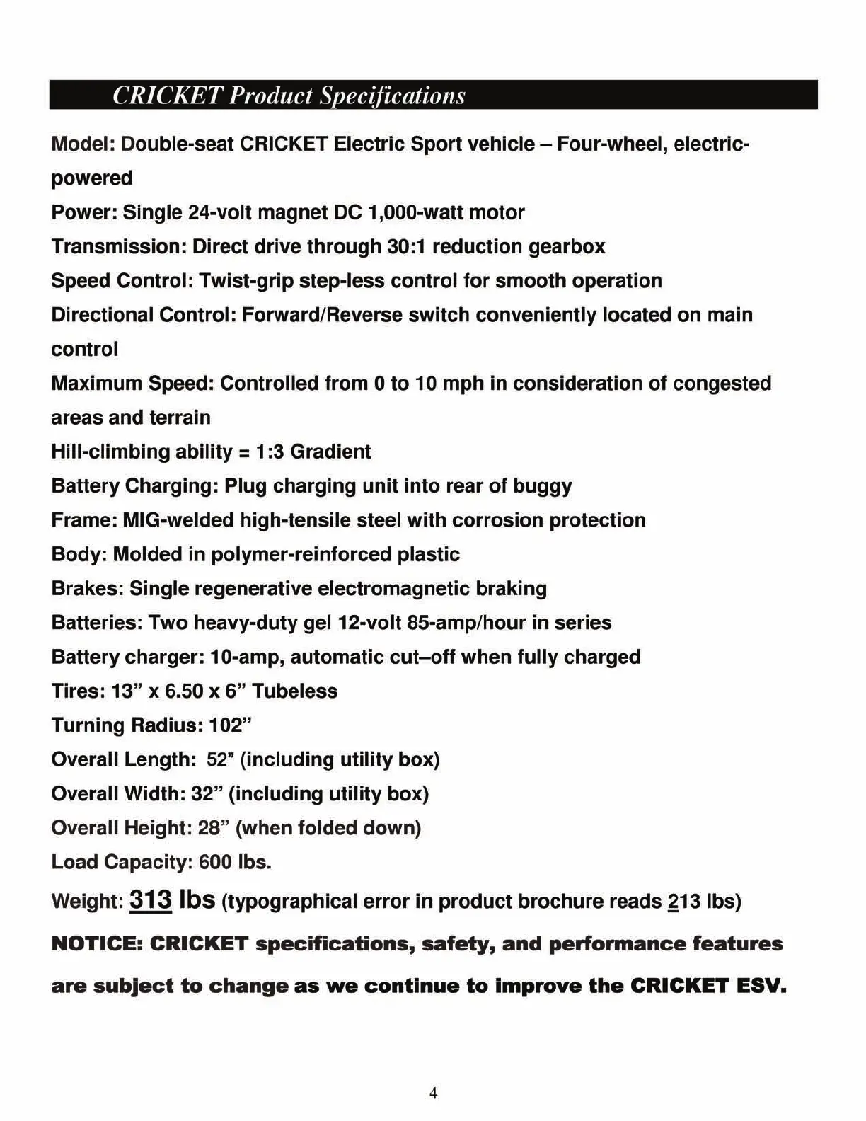 Rick's CRICKET - CRICKET Product Specifications; Key Vehicle Specifications; Specifications Disclaimer