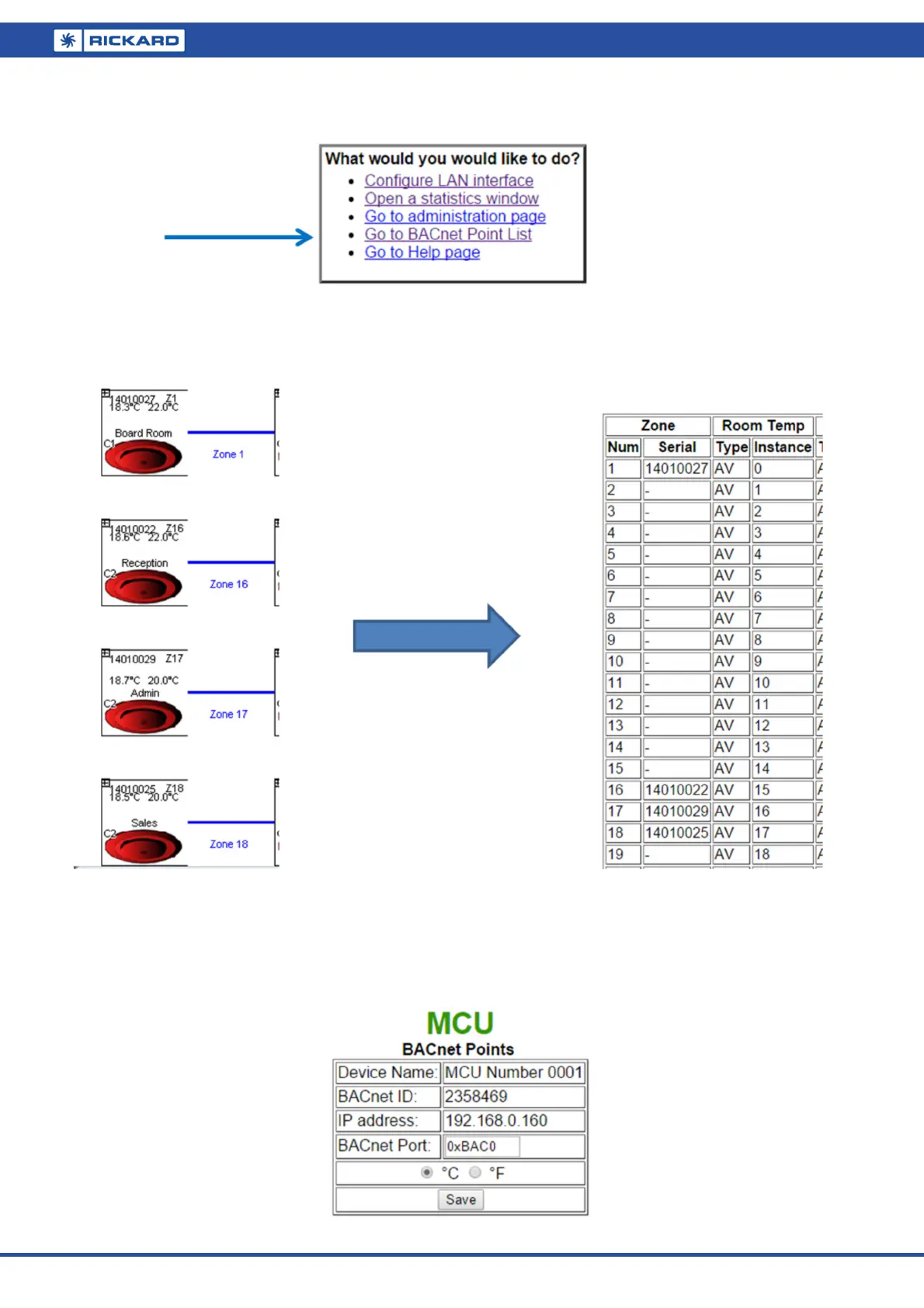 The BACnet point list table can be browsed from the main web page as indicated below (BACnet/IP only):