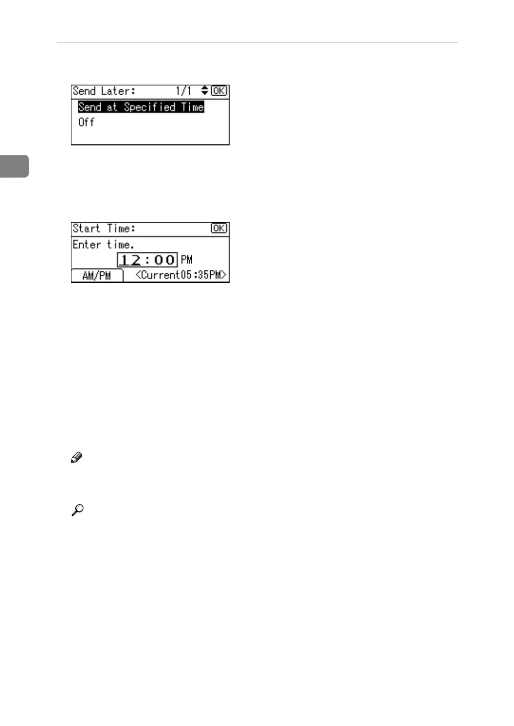 D Select [Send at Specified Time] using {U} or {T}, and then press the {OK} key.
