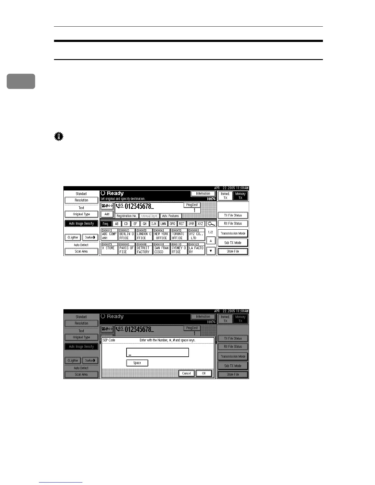 entered. For details about the SEP Code, see “Box Settings” in “Facsimile Fea-