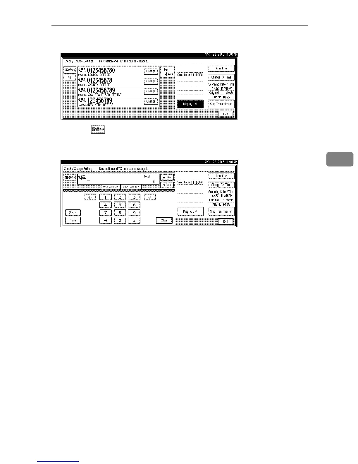 Pressing switches the destination list between fax number, e-mail ad-