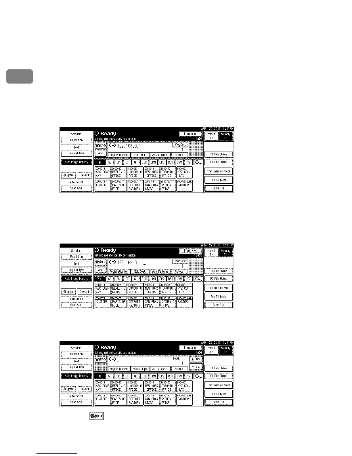 Press [ProgDest] in order to store the entered IP-Fax destination in the Address