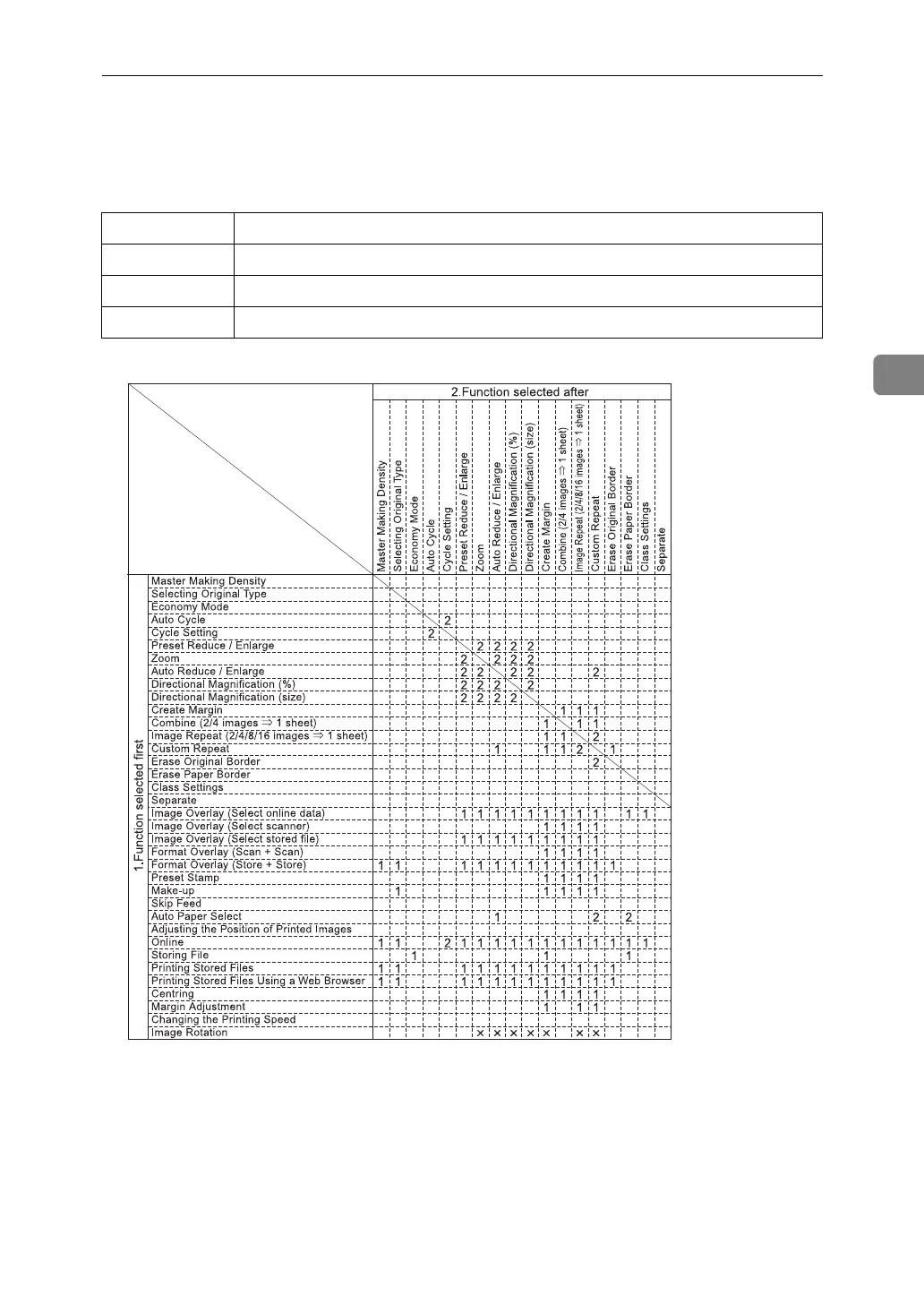 This combination chart shows which functions can be used together.