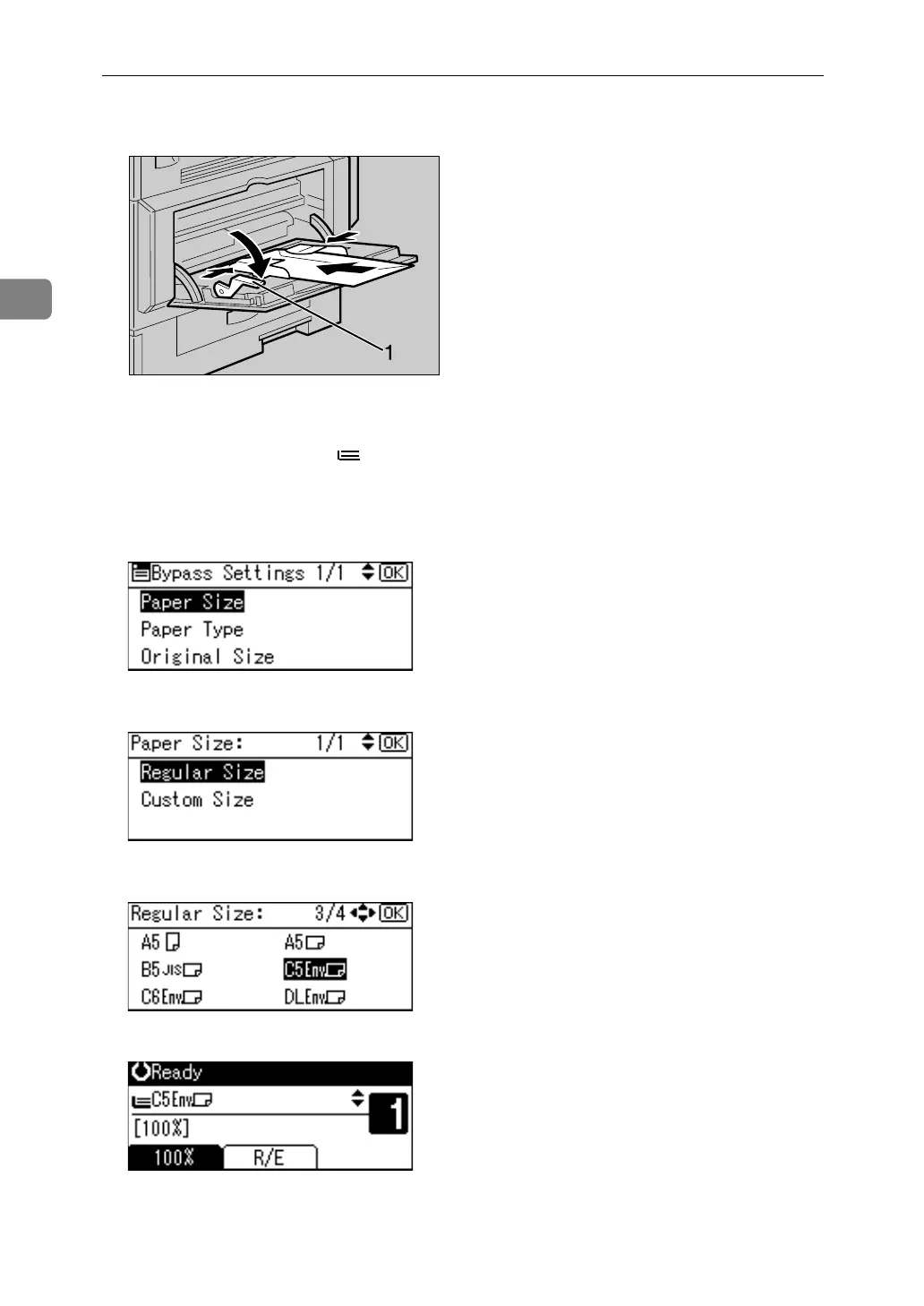 F Select the envelope size using {U} or {T}, and then press the {OK} key.