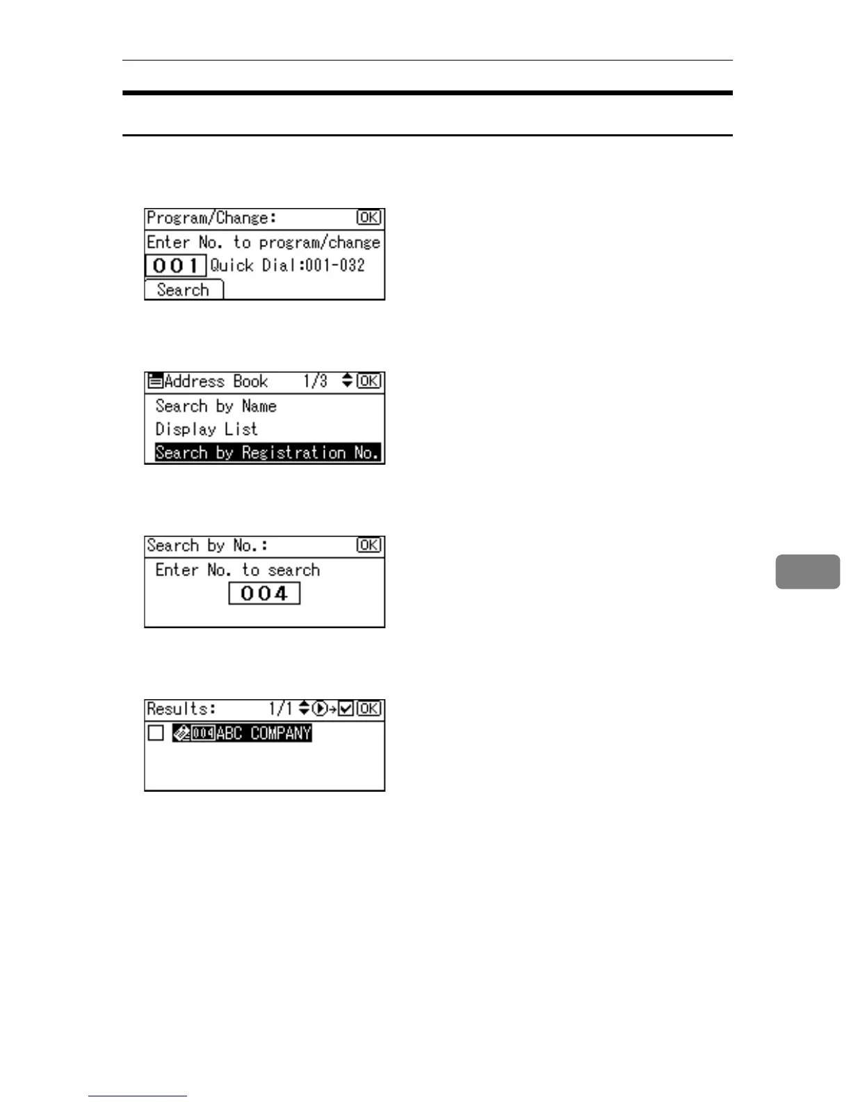 B Select [Search by Registration No.] using {U} or {T}, and then press the {OK}