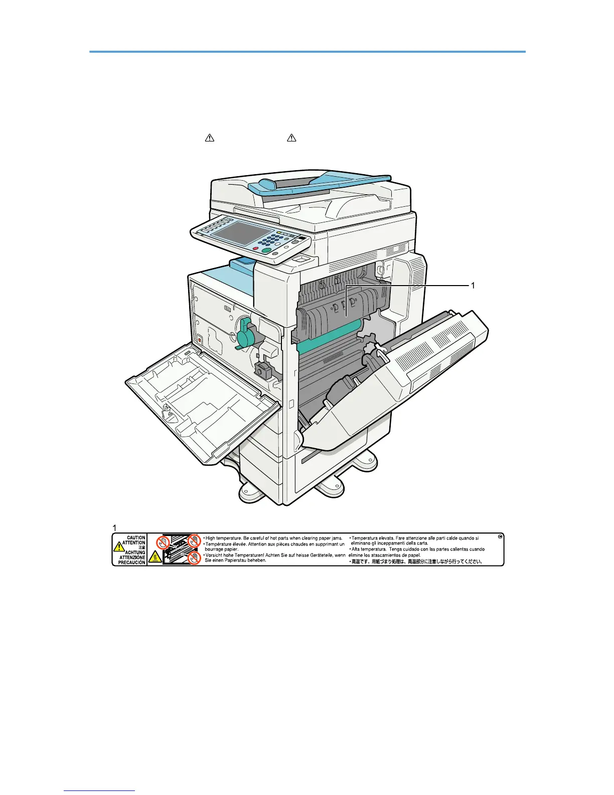 High temperature. Be careful of hot parts when clearing paper jams.