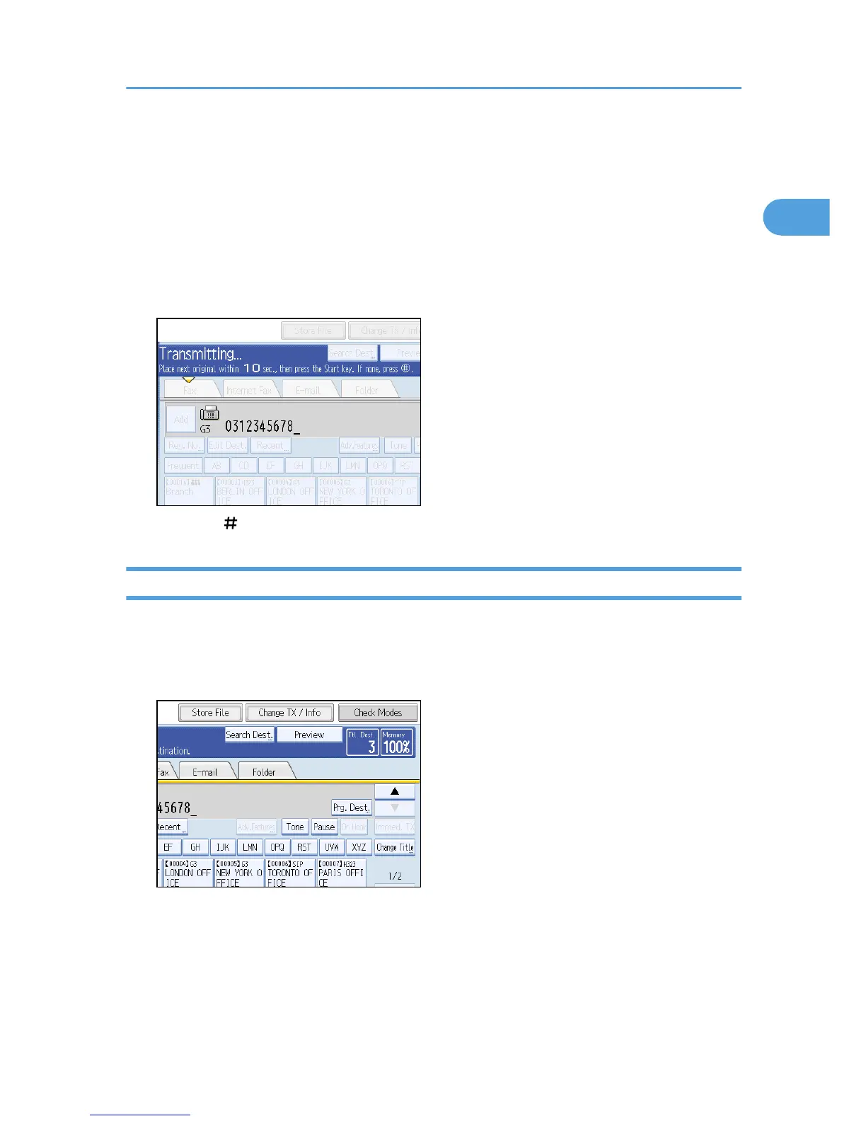 On this screen you can check the destination, transmission mode, and other transmission settings before