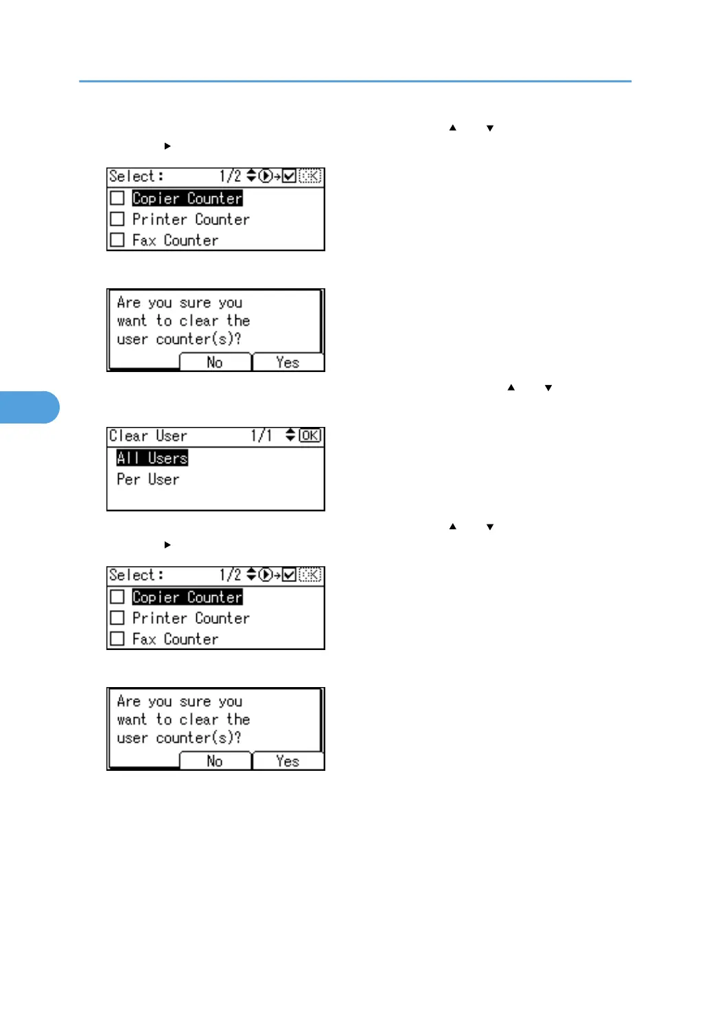 9. Select the function you want to clear the counter for using [ ] or [ ], then confirm it by