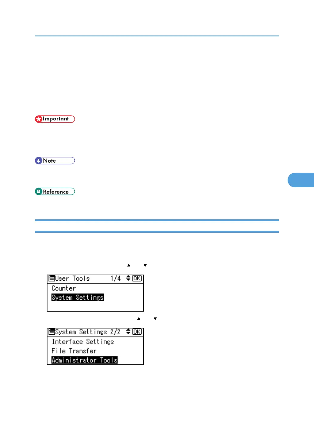 3. Select [Administrator Tools] using [ ] or [ ], and then press the [OK] key.