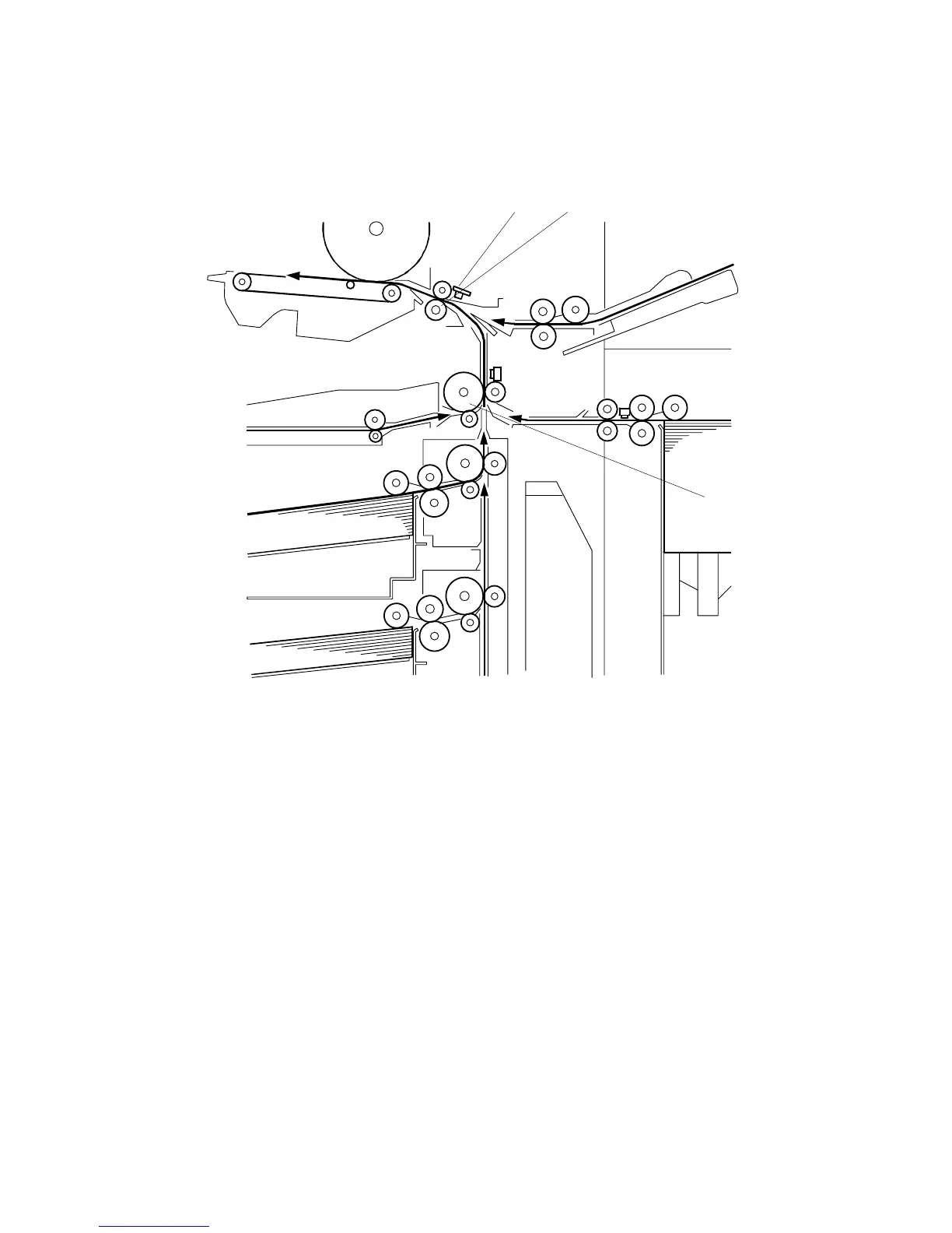 with the image on the drum. The registration and relay rollers feed the paper to the