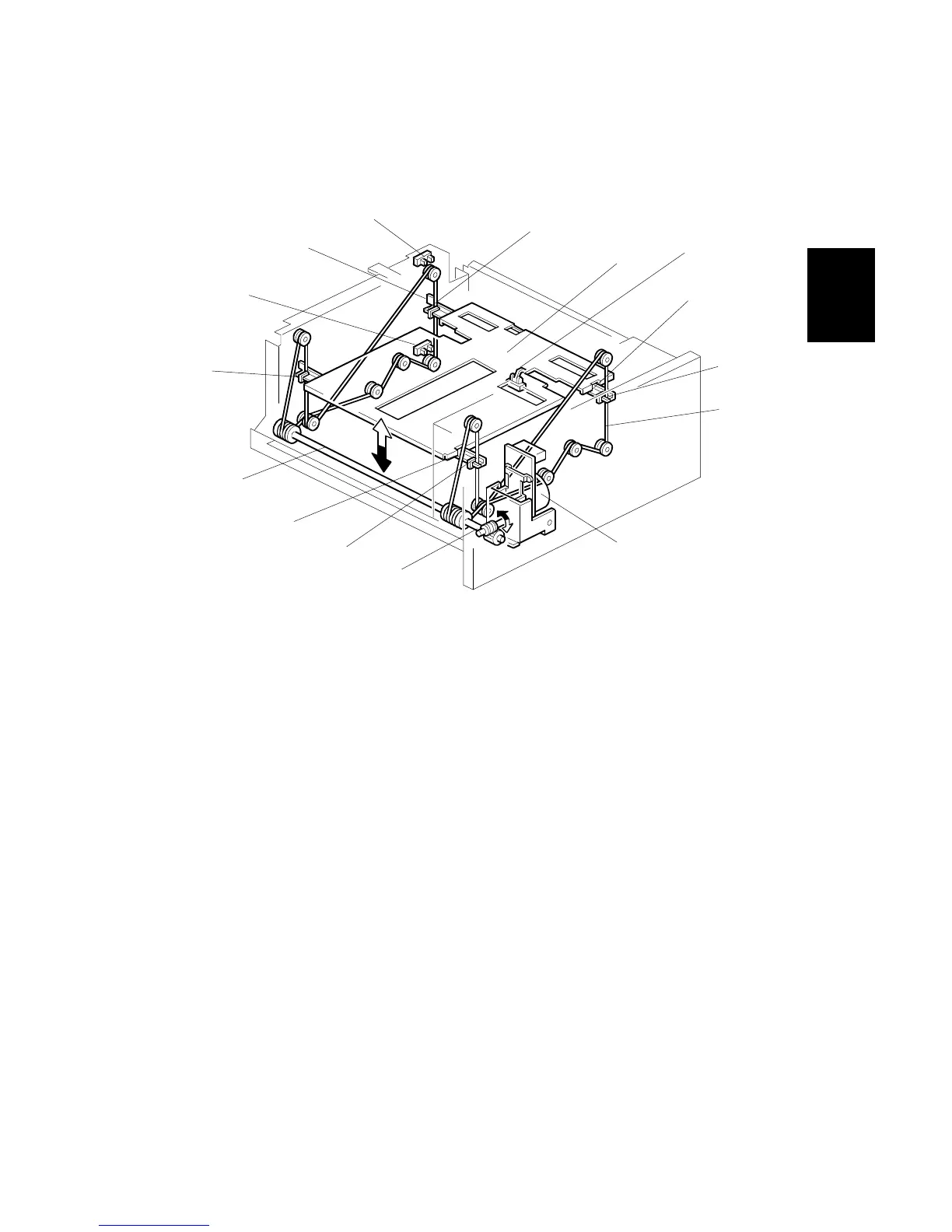 To lower the tray bottom plate [H], the LCT motor reverses and the drive pulley