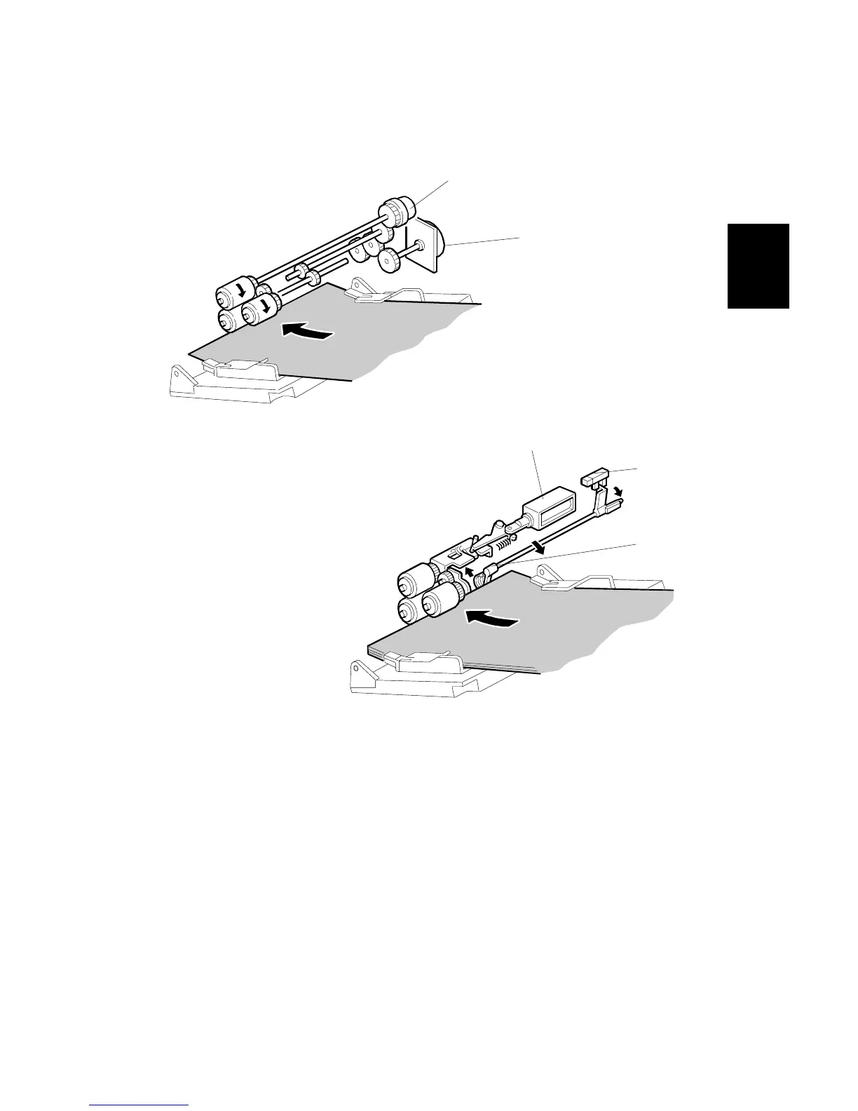 drives the rollers. The pick-up solenoid [B] drops the pick-up roller onto the top