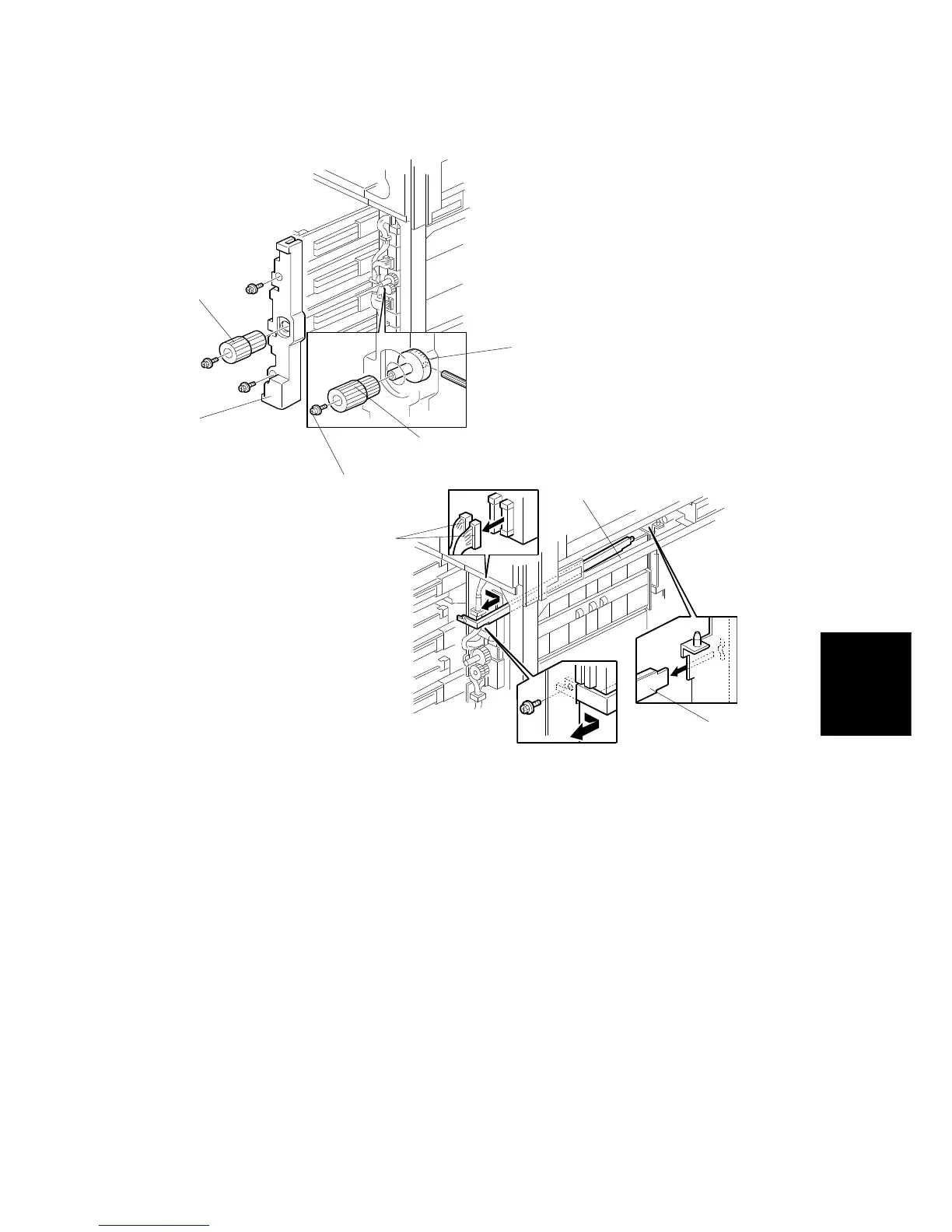 6. Pull out all paper trays, then remove the paper tray unit inner cover [D] (2