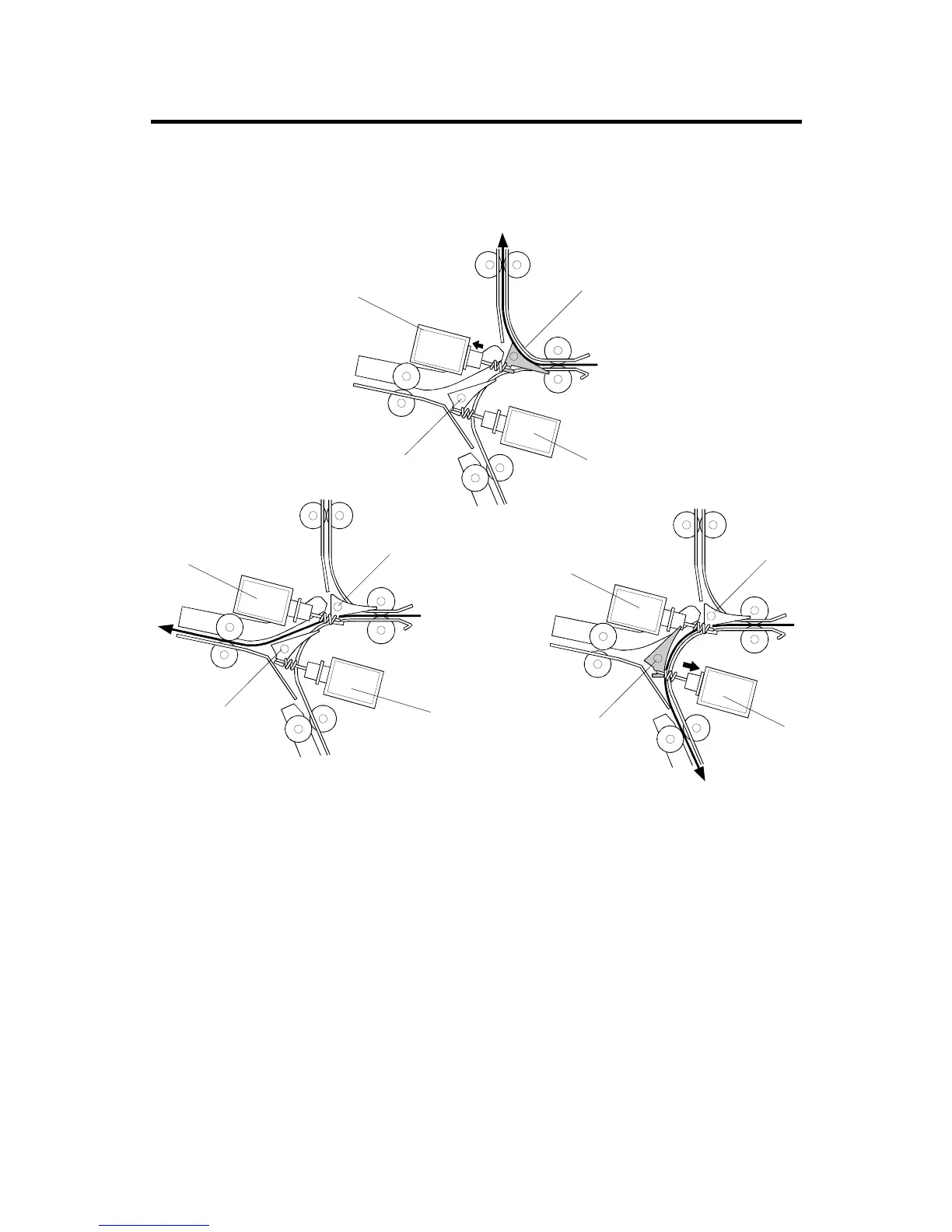 Depending on the finishing mode, the copies are directed up, straight through, or