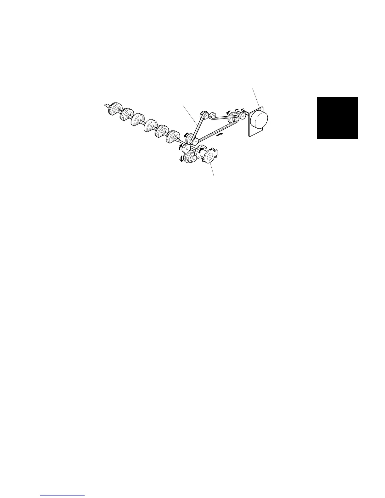 gears, the timing belt [B], and the paper feed clutch [C].
