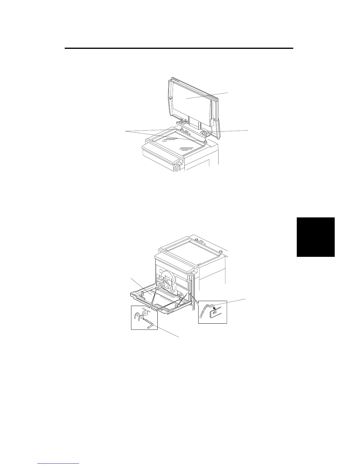 2. Slide the platen cover [B] to the right to unlock it. While lifting the hook [C]