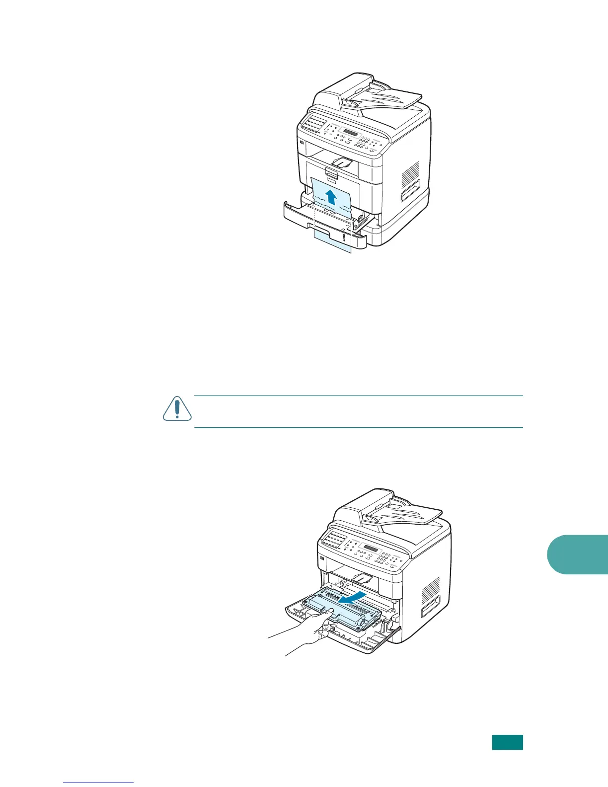 : The fuser area is hot. Take care not to burn your