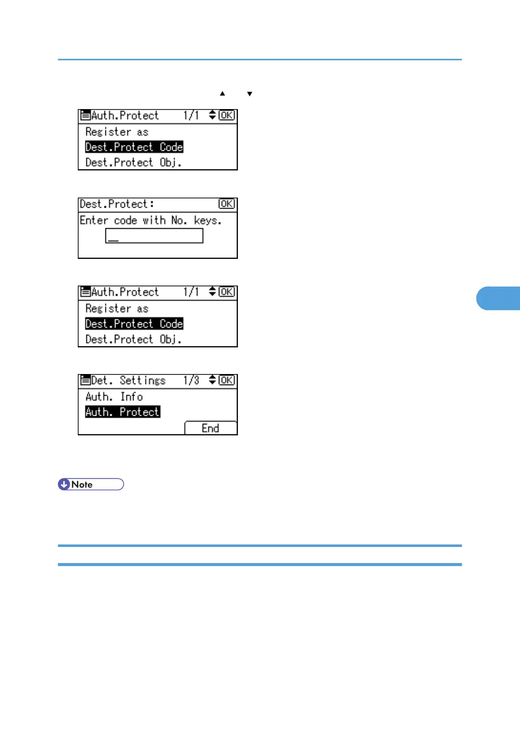 16. Select [Dest.Protect Code] using [ ] or [ ], and then press the [OK] key.