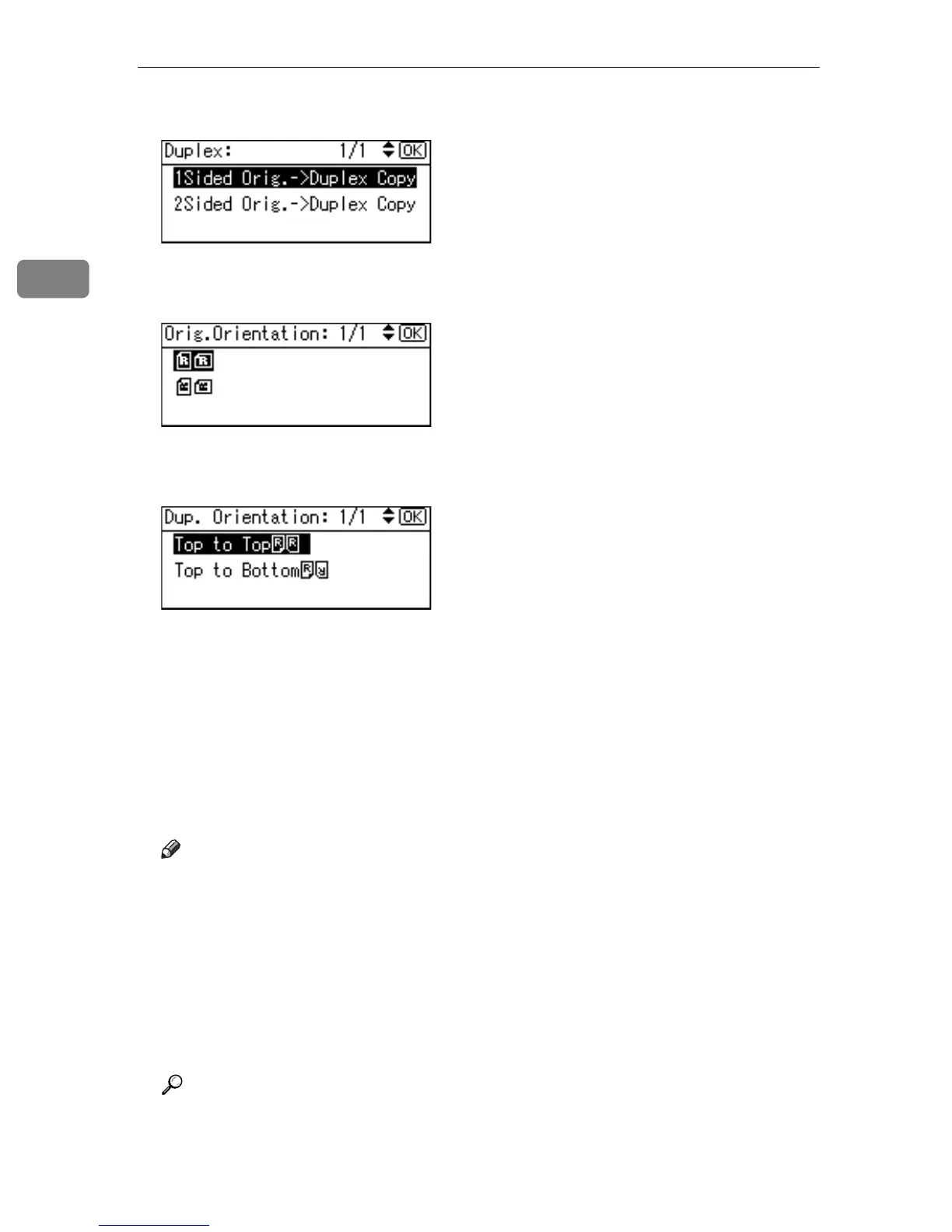 D Select the duplex orientation using {U} or {T}, and then press the {OK}