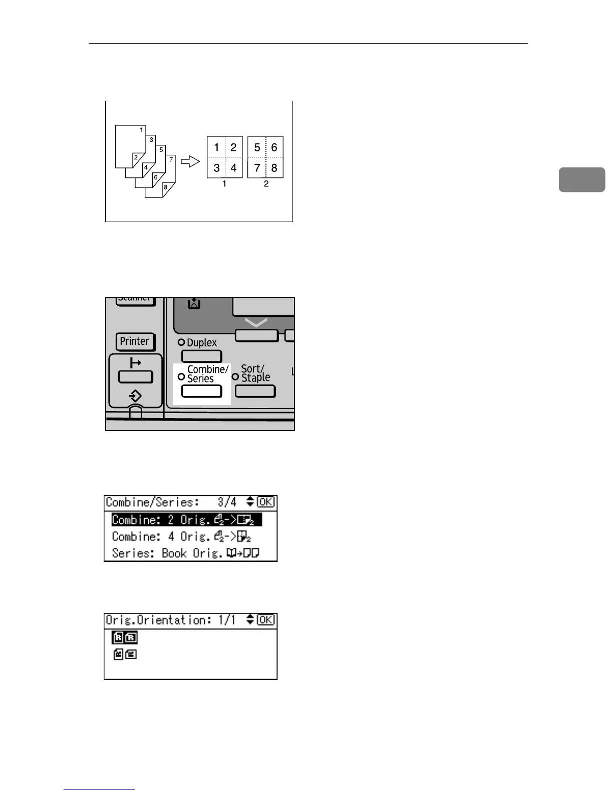 Copies 4 two-sided originals to one sheet with four pages per side.