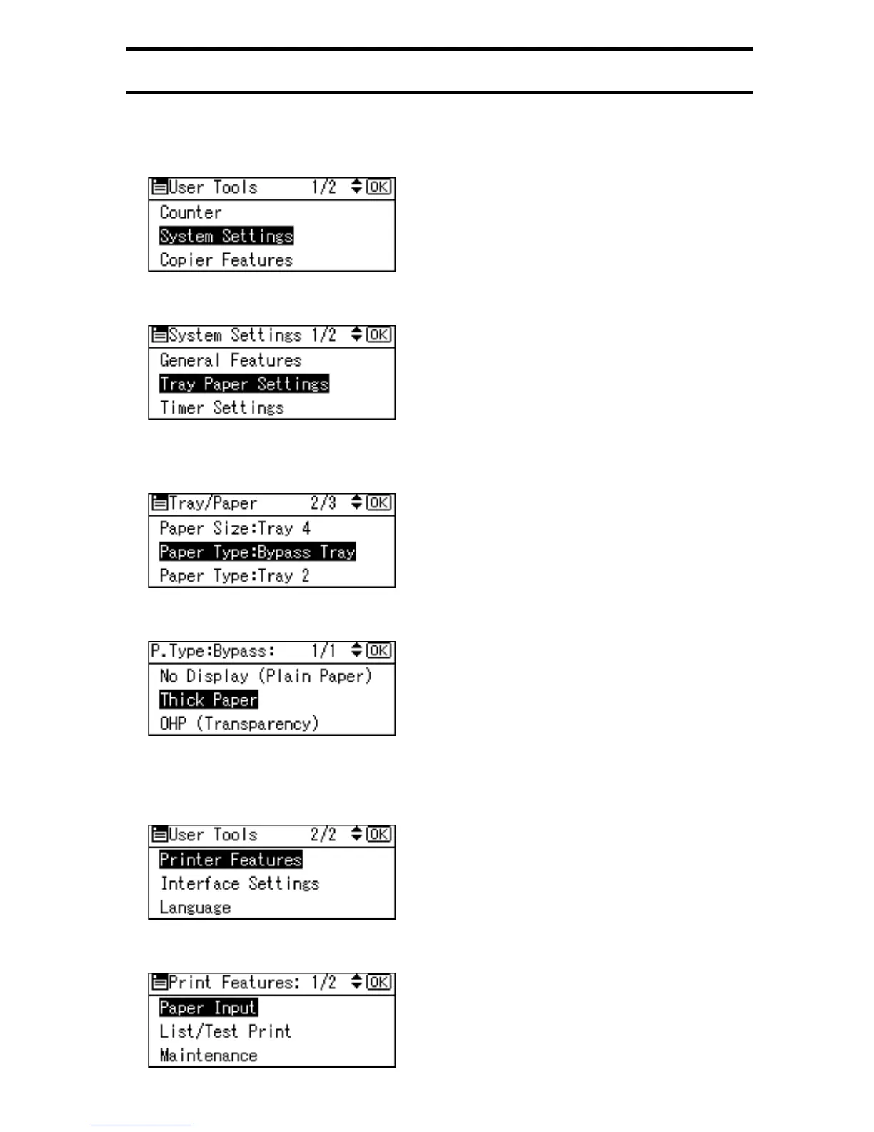 D Select [Paper Type: Bypass Tray] using {U} or {T}, and then press the {OK}