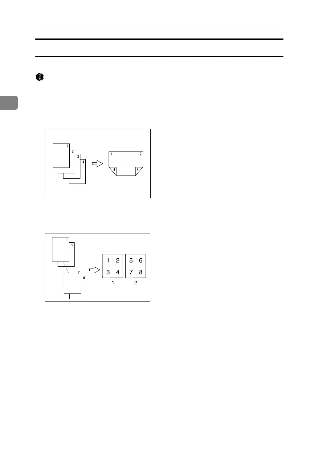 Copies 8 one-sided originals to one sheet with four pages per side.