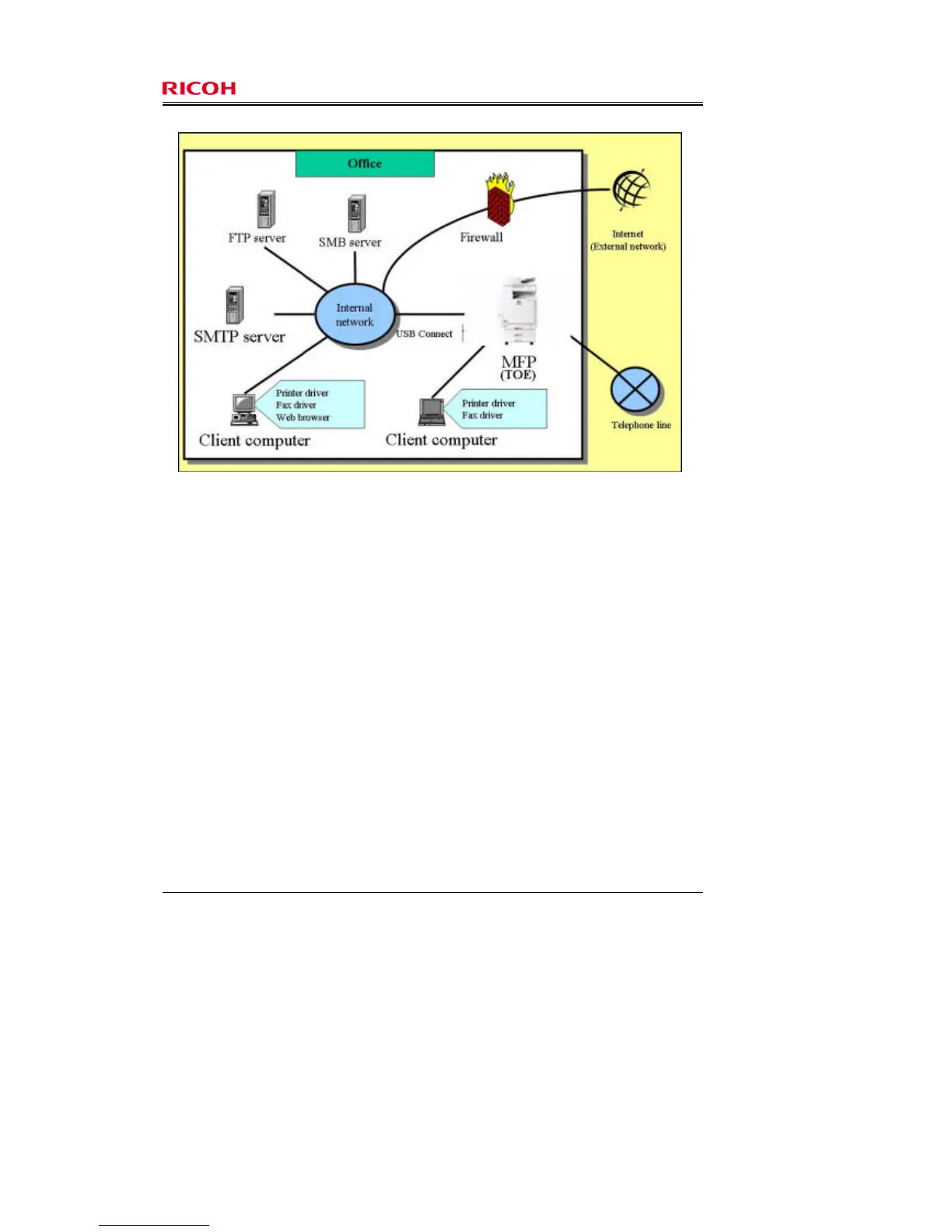The internal network connects the TOE with various types of servers (FTP, SMB, and SMTP servers) and