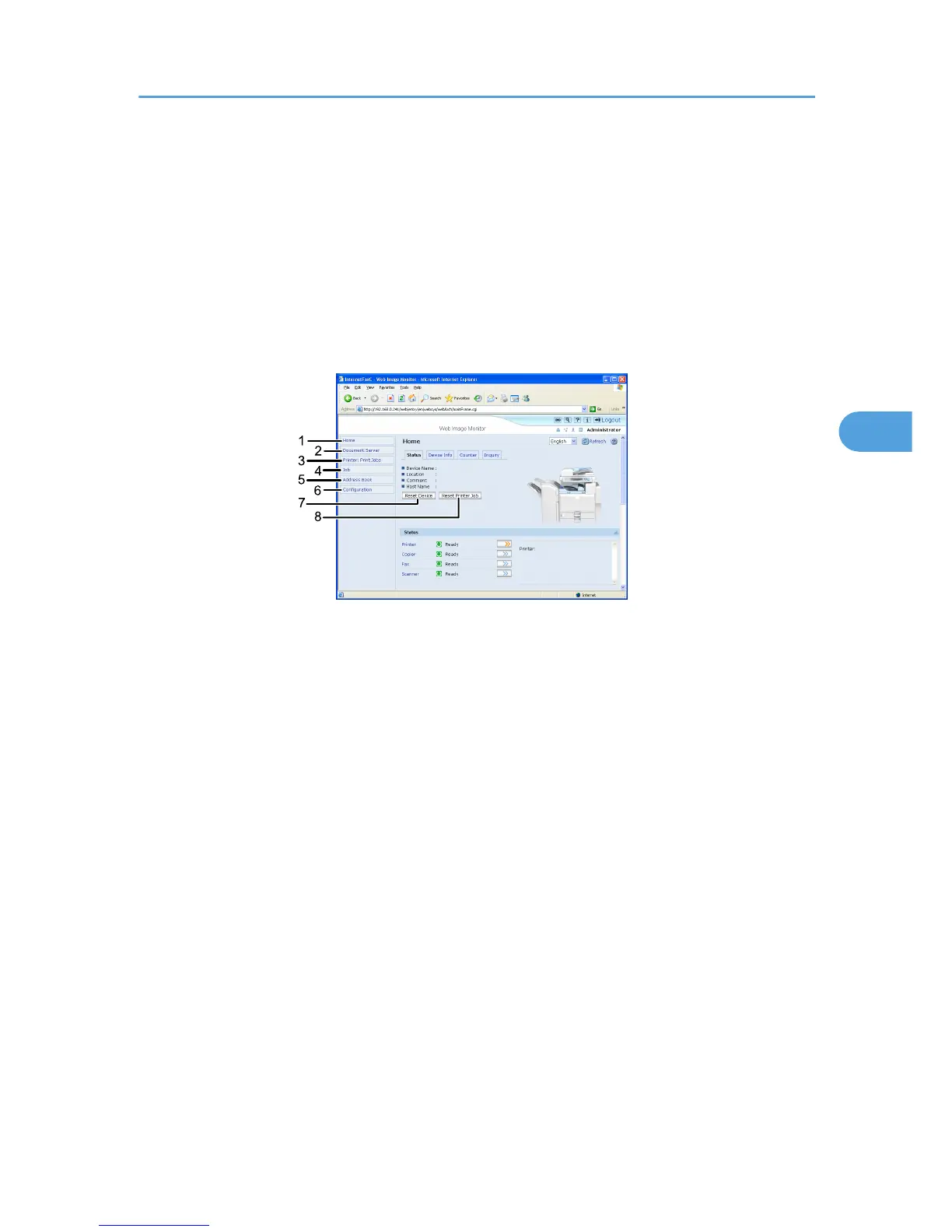 The [Status], [Device Info], [Counter], and [Inquiry] tab are displayed. Details of the tab menu are displayed on