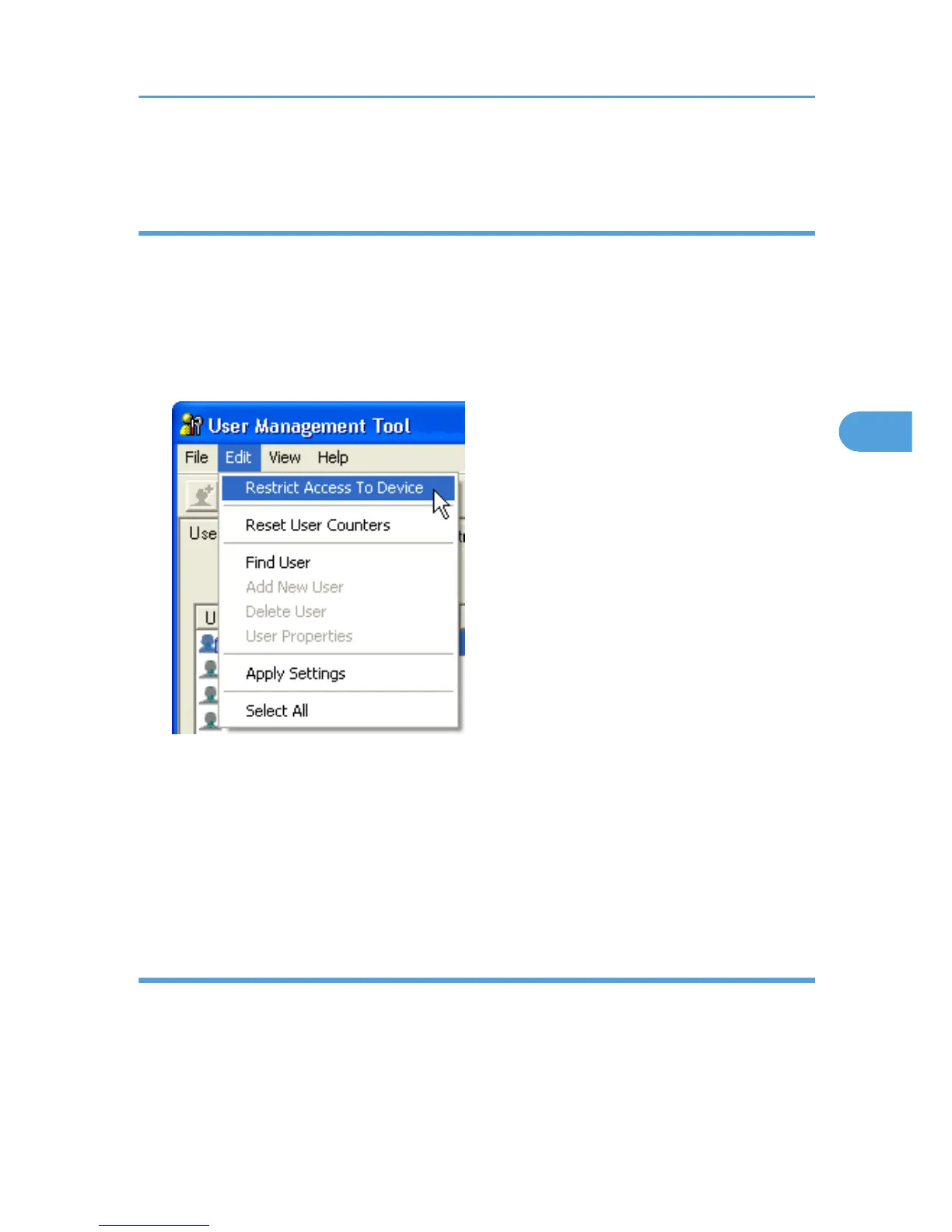 4. On the [Edit] menu of User Management Tool, click [Restrict Access To Device].