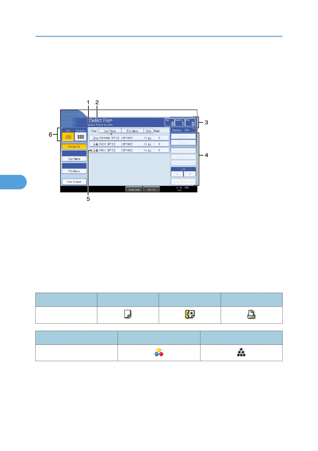 5. Displays an icon that indicates the function and colour mode used to stored the document.