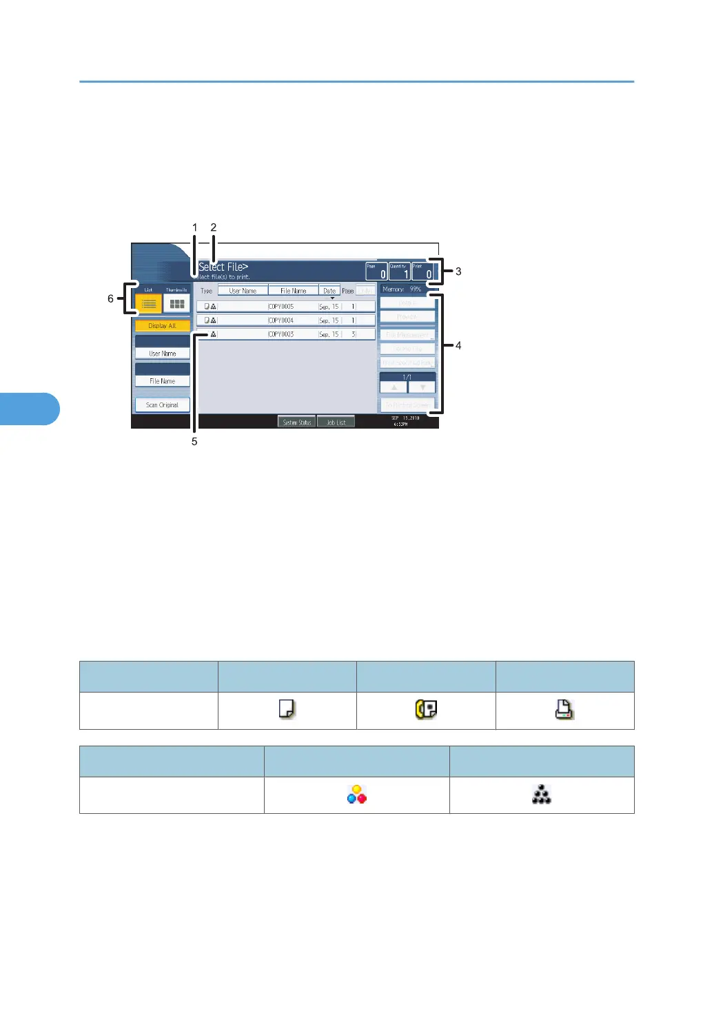 5. Displays an icon that indicates the function and color mode used to store the document.