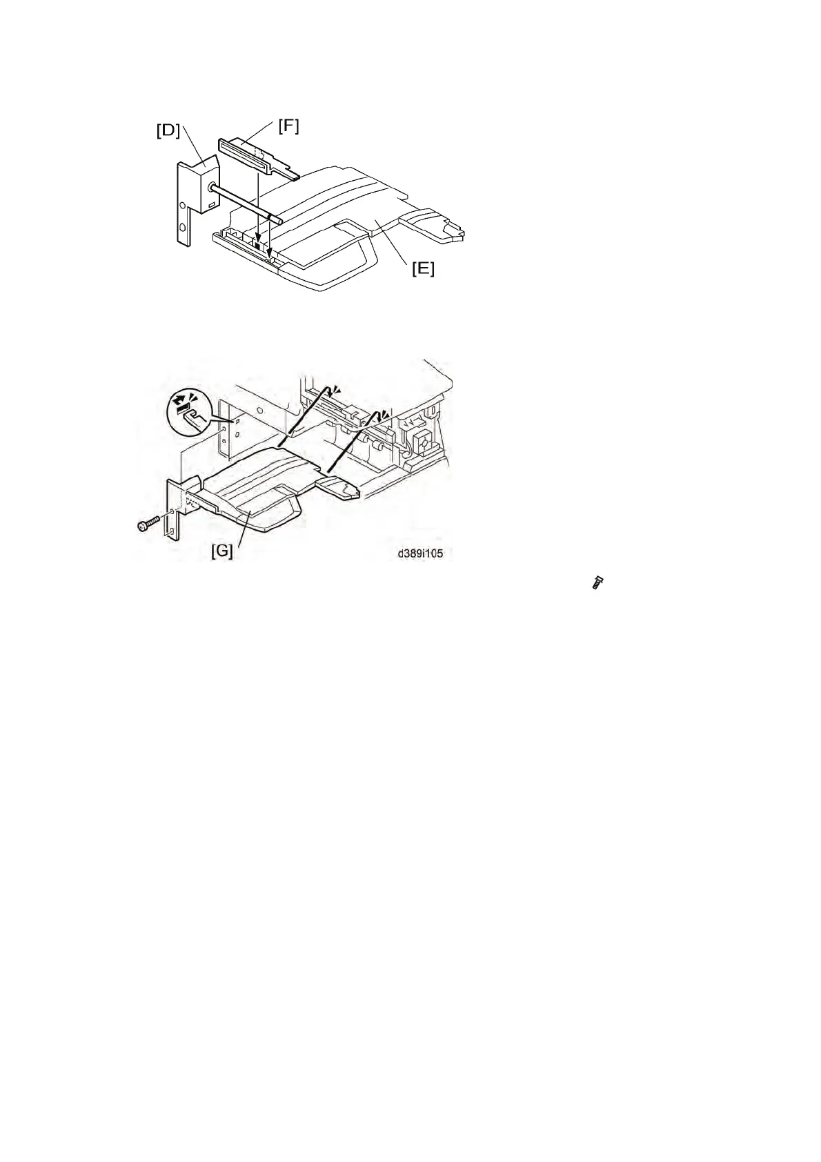 6. Attach the tray support bar [D] to the tray [E] as shown, and then attach the end-fence