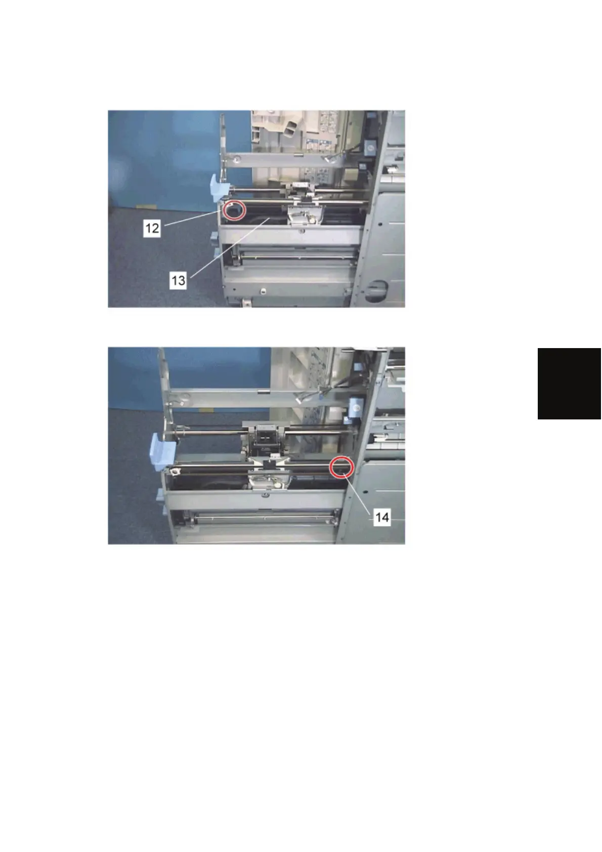 11. Remove the screw [12] that holds the front of the guide plate [13].