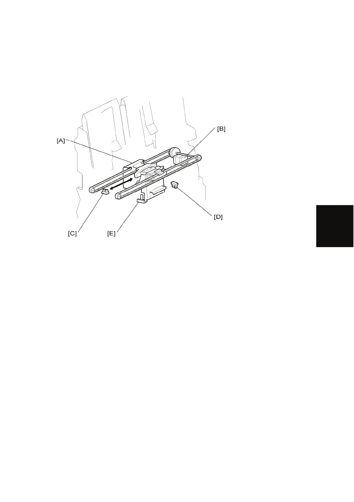 The stapler unit motor [B] moves the stapler from side to side. The stapler unit HP sensor