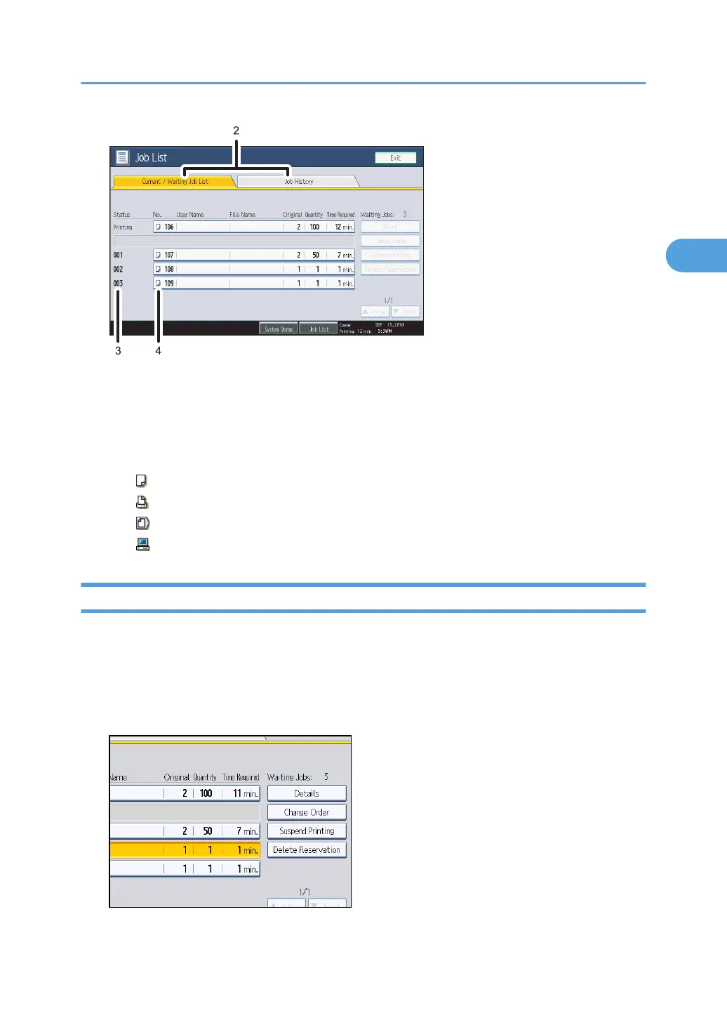 2. Switches between [Current / Waiting Job List] and [Job History].
