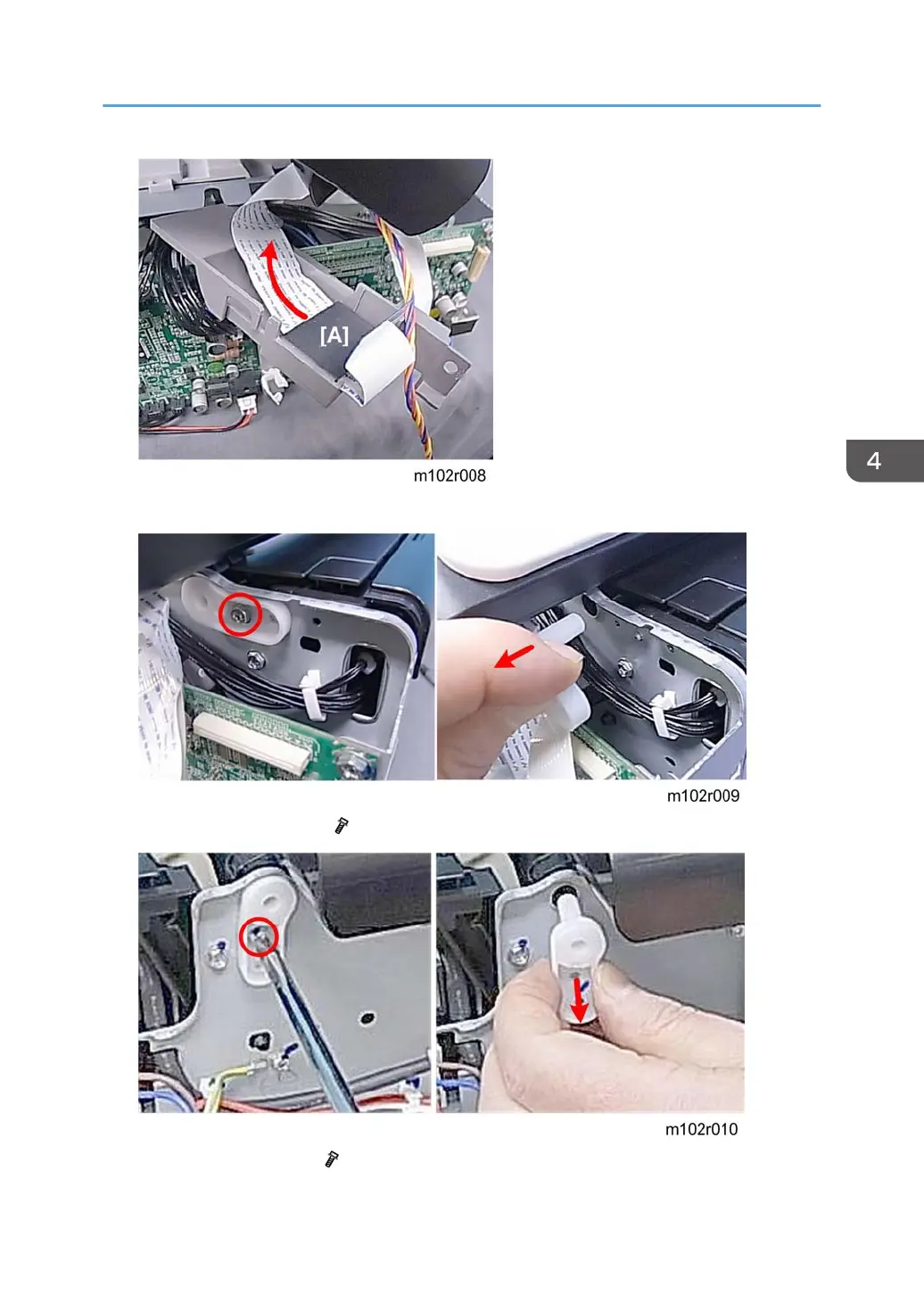 4. Pull the flat cable out of the ferrite plate [A], and then remove the harness guide.