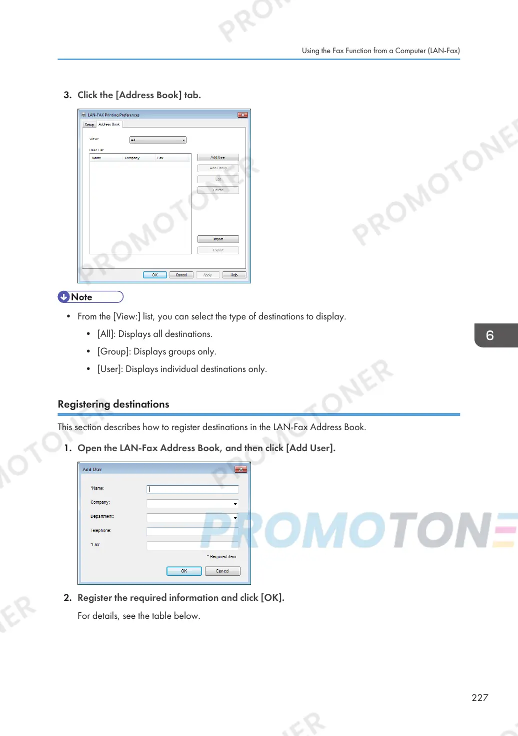 This section describes how to register destinations in the LAN-Fax Address Book.