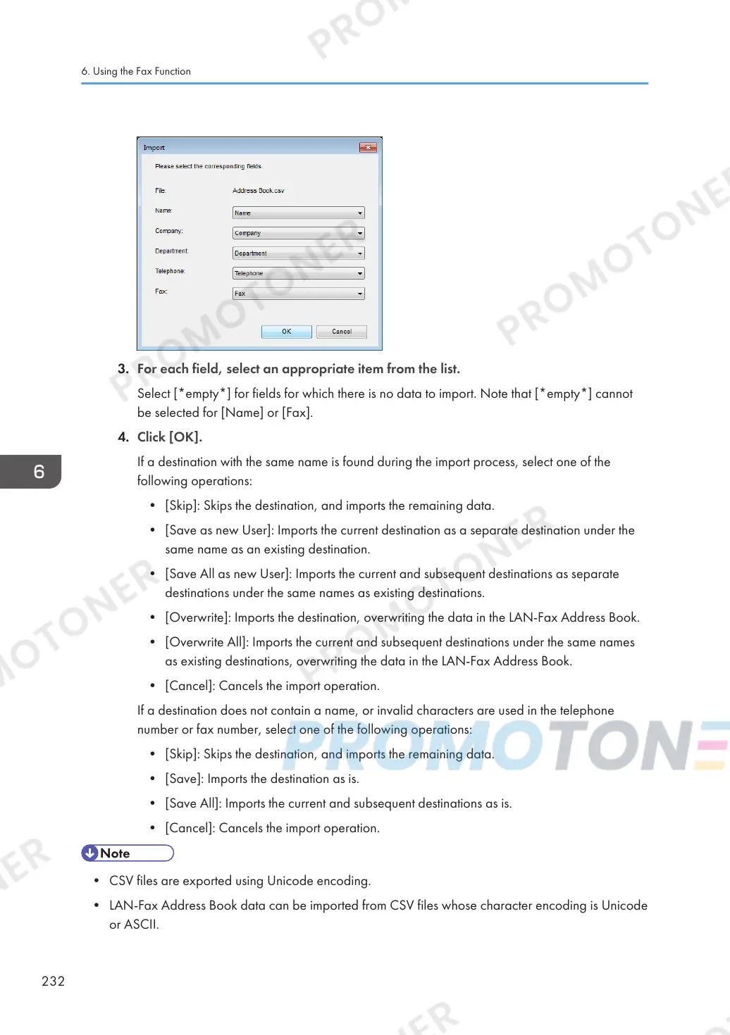 • [Overwrite]: Imports the destination, overwriting the data in the LAN-Fax Address Book.