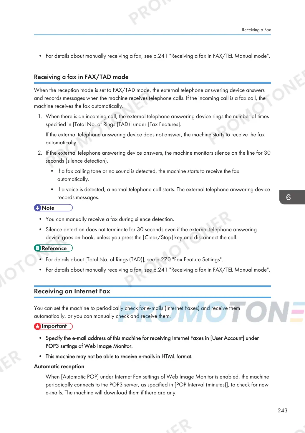 • For details about manually receiving a fax, see p.241 "Receiving a fax in FAX/TEL Manual mode".